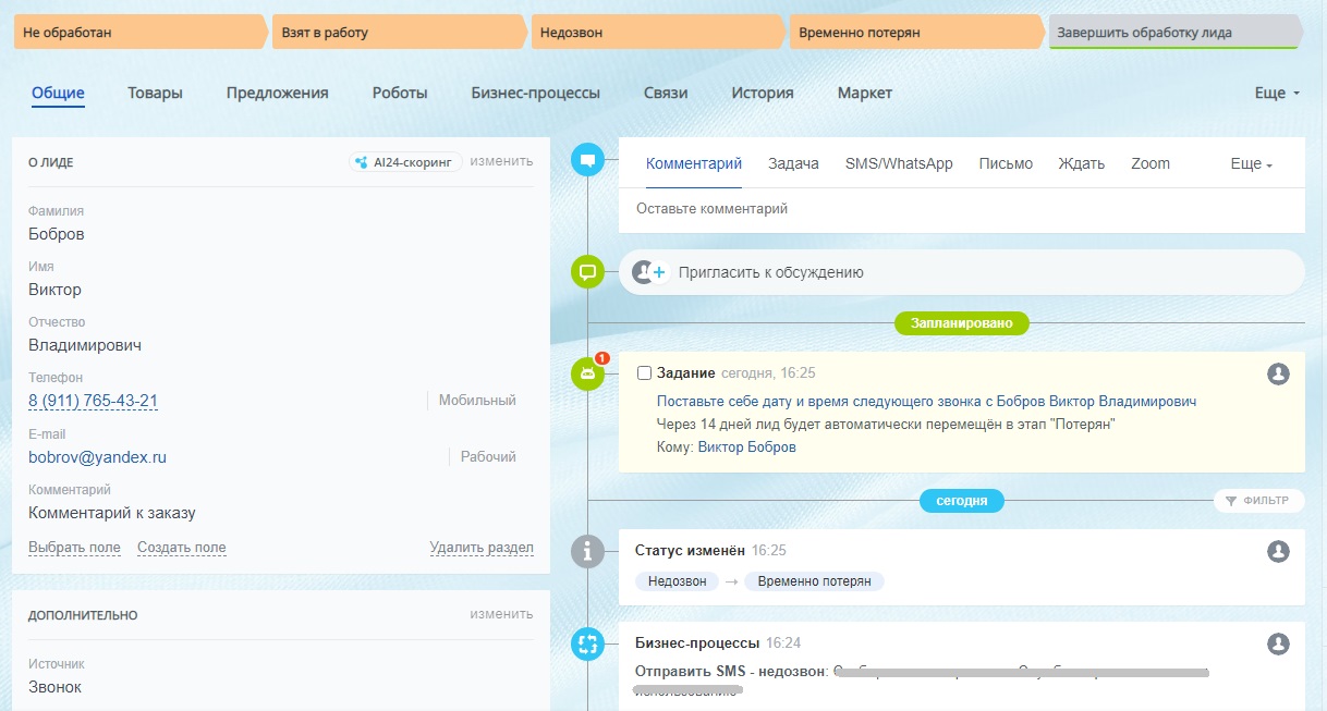 Недозвон - менеджер переводит Лид в данный статус, если связаться с клиентом не получается. Здесь настроен робот, который отправляет клиенту sms о том, что не удается с ним связаться.