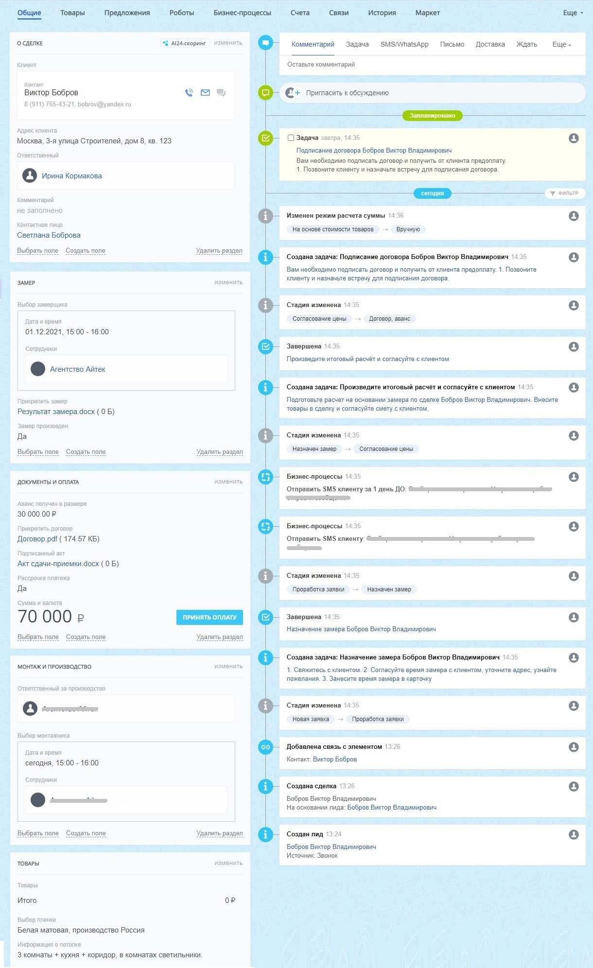 Назначен замер – замерщику ставим задание, а клиенту отправляем серию напоминаний о дате времени замера, контролируем результат замера.