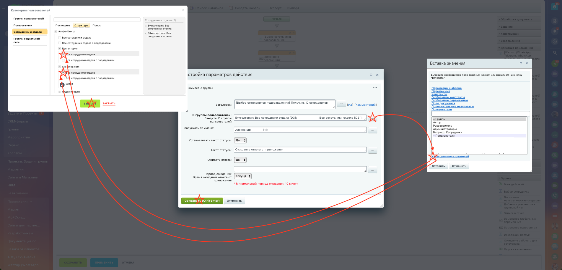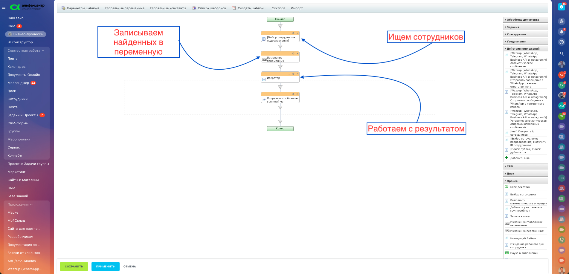 Далее можно применять любые действия которые могут работать с множественной переменной с типом "Пользователь" (Итератор, Отправка сообщения, выбор сотрудника, и тд)