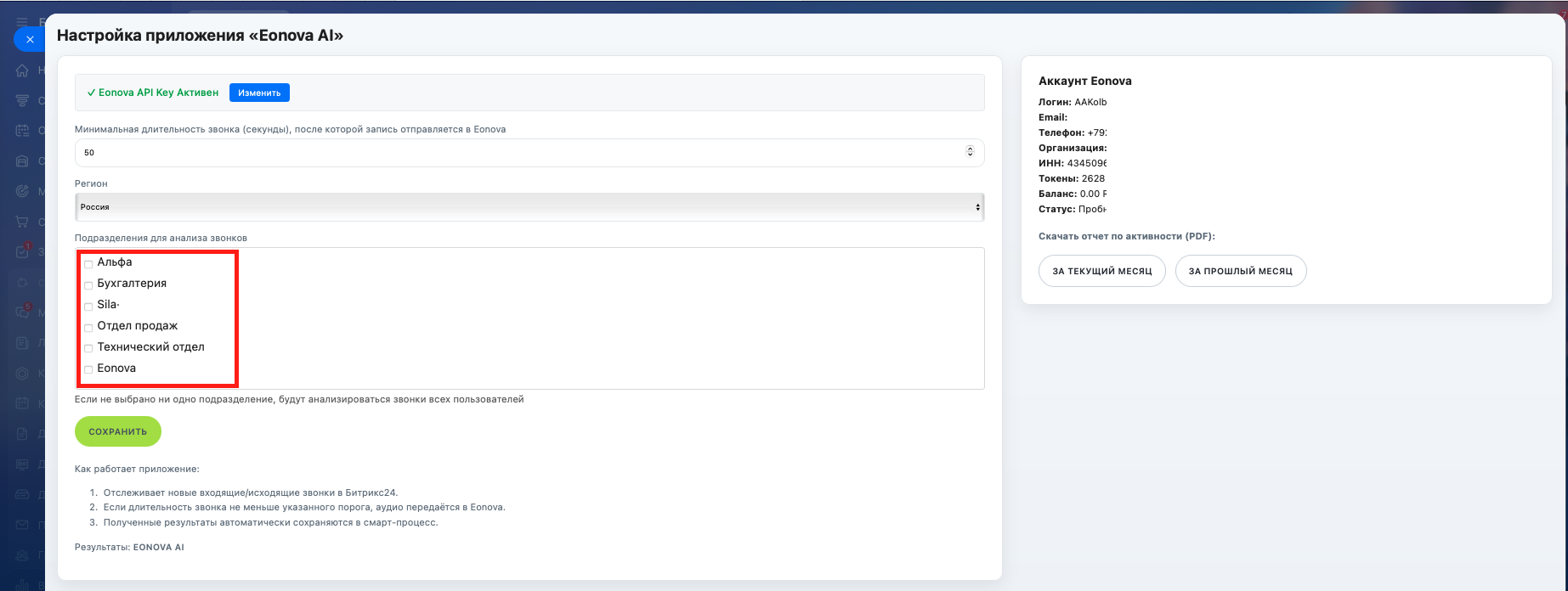 Добавлен функционал выбора подразделений, звонки из которых будут отправляться на AI анализ