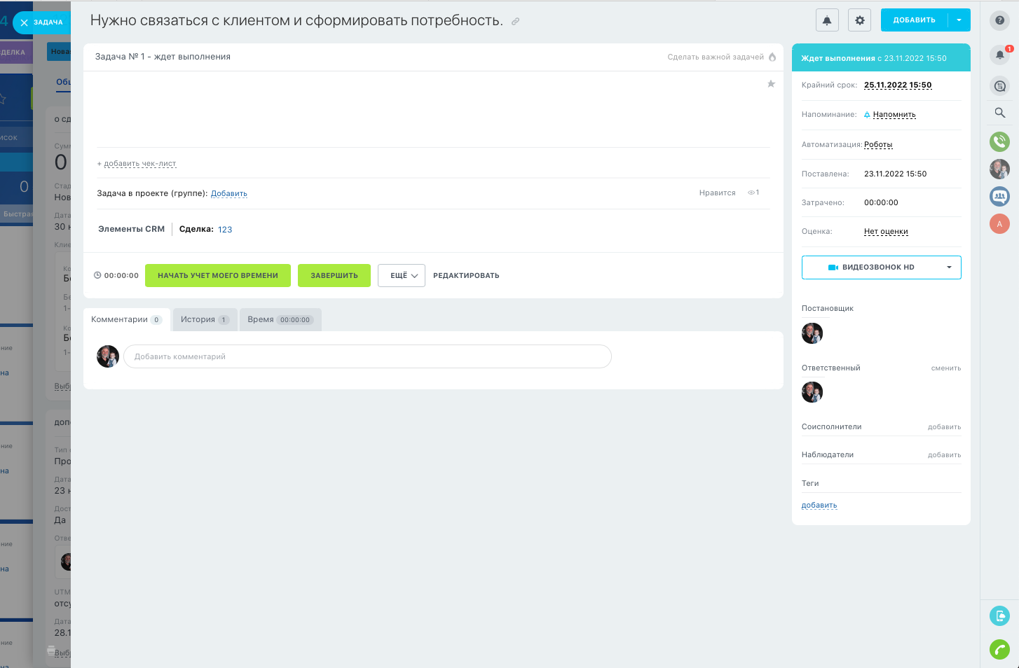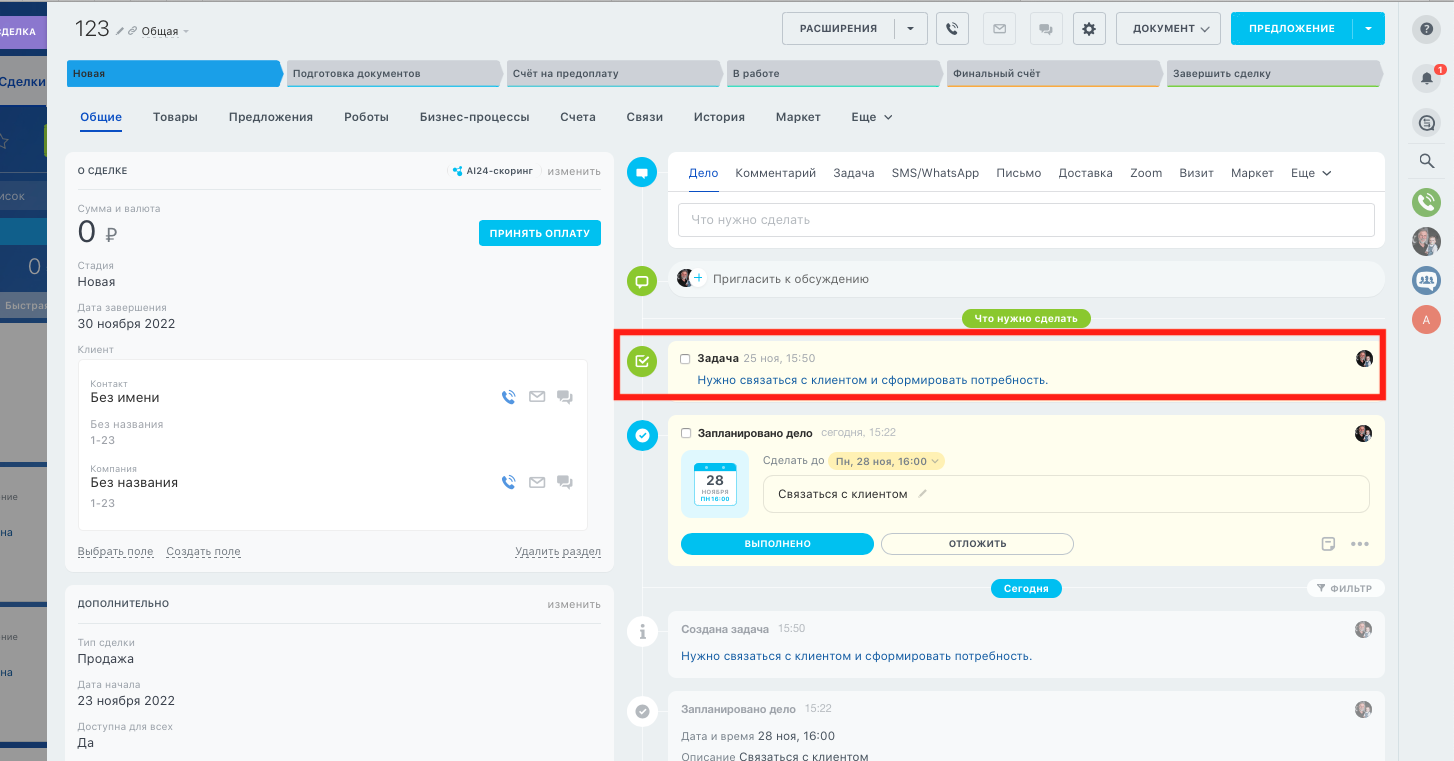 6. По всем выбраним сделкам будут поставлены задачи "Нужно связаться с клиентом и сформировать потребность."