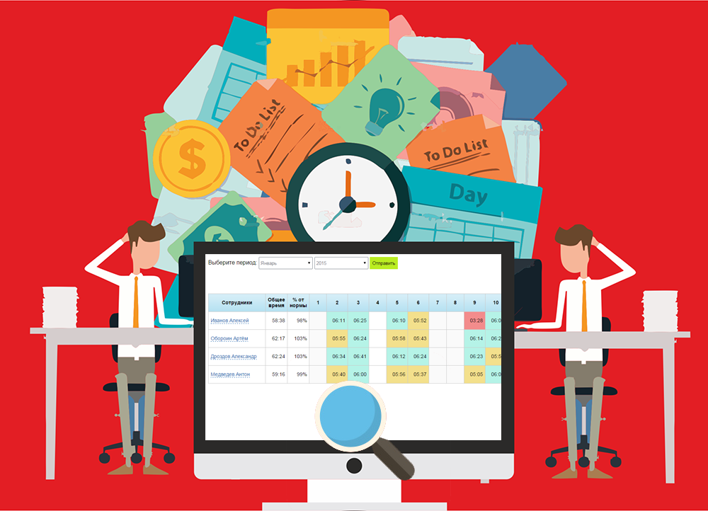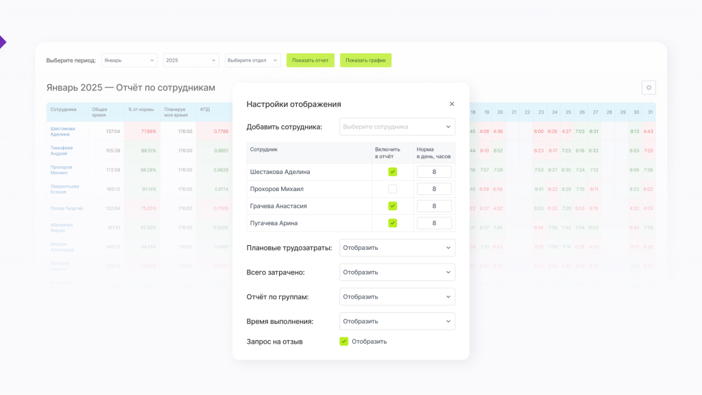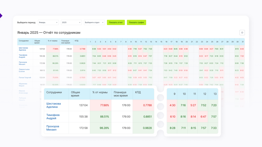 Вы указываете сколько часов должно быть указано в отчете. В таблице в зависимости от фактических результатов цветом показывается был ли выполнен план или нет. За каждый день можно получить отчет, какие задачи в нем выполнялись и сколько времени потребовали у Исполнителя.