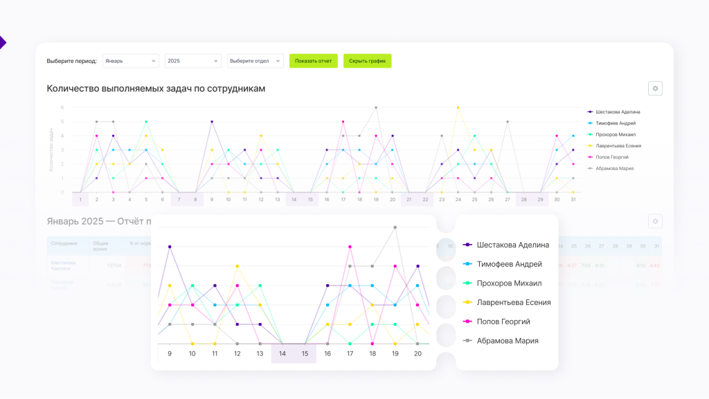 6. Отчет умеет показывать график выполнения количества задач в разрезе списка сотрудников.