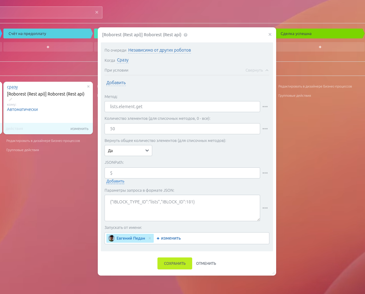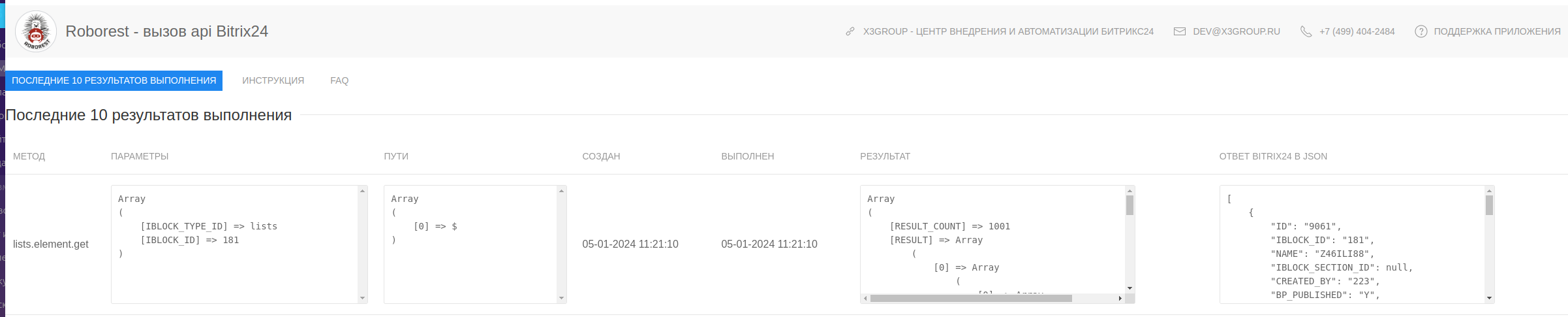Позволяет выполнять запросы Rest api https://dev.1c-bitrix.ru/rest_help/index.php с помощью роботов, получать множественный результат выполнения.