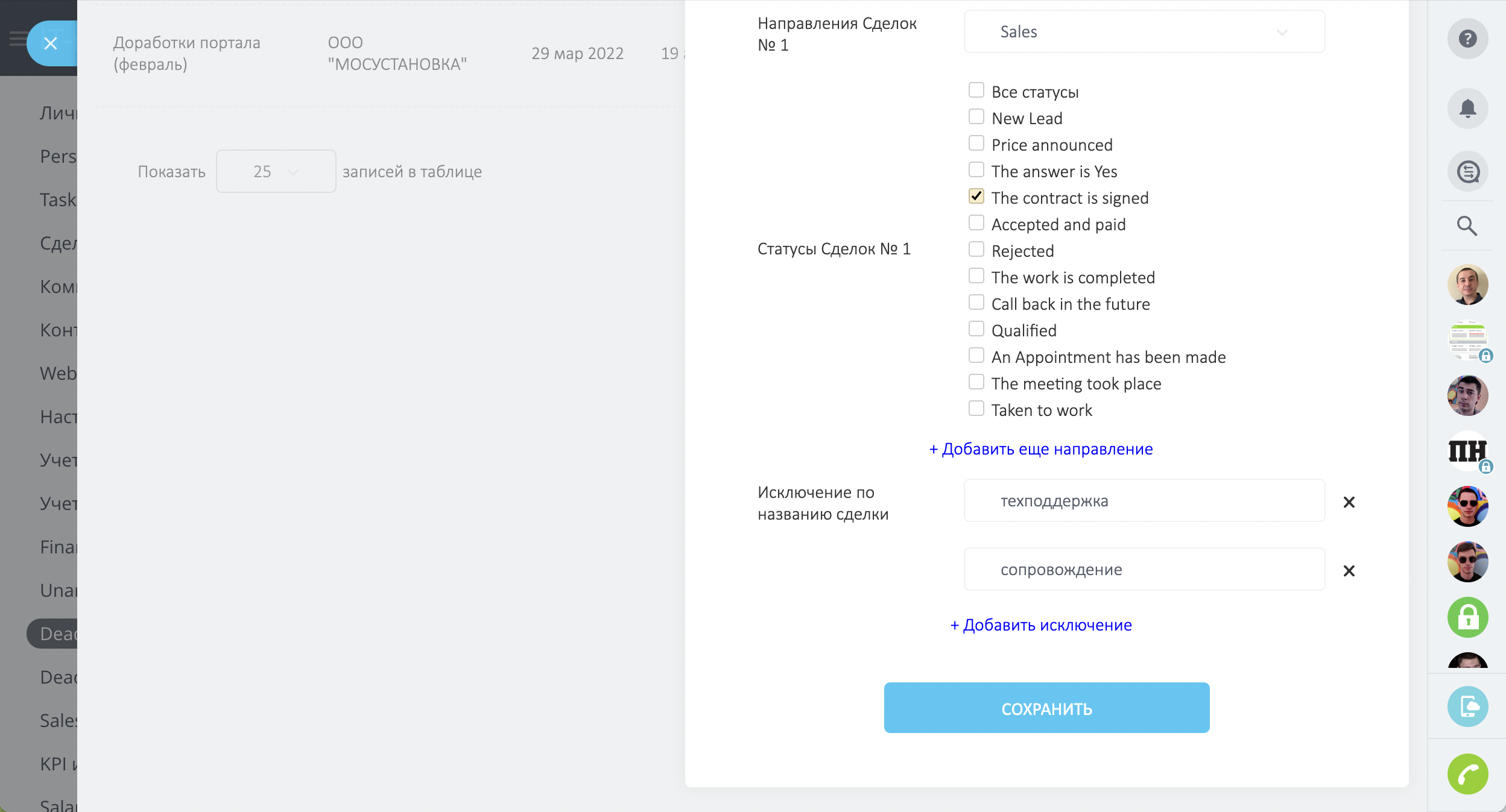 - Кроме того, можно настроить исключения, не относящиеся к проектам, по ключевым словам в названии Сделок.