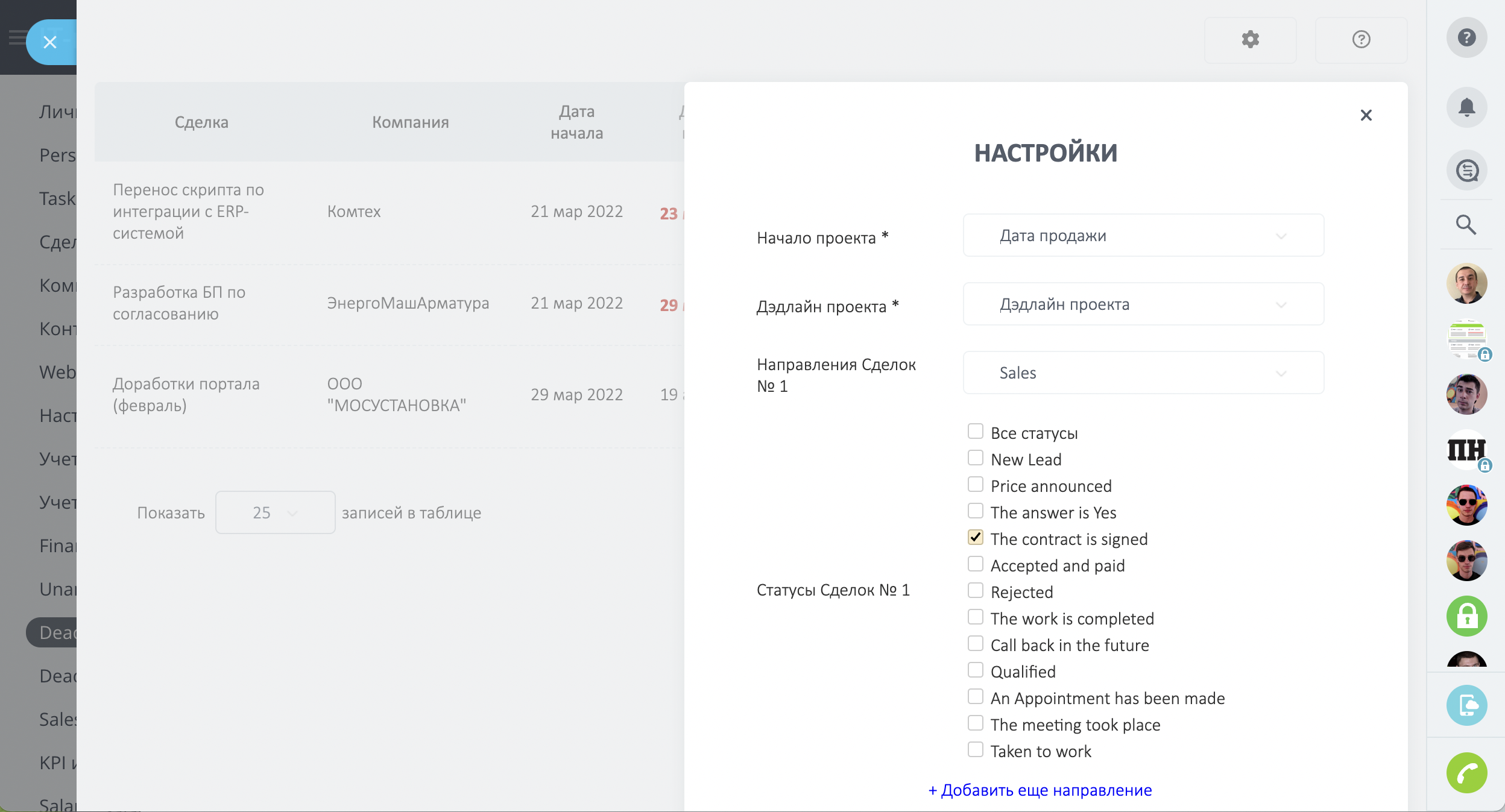 - В настройках можно выбрать, из каких полей Сделки берется начало и дэдлайн проекта, а также какие направления и статусы нужно выводить в списке текущих проектов.