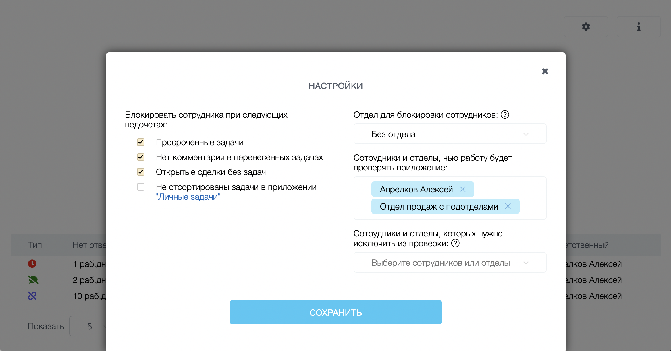 - Выбираете отделы и Сотрудников, которых нужно контролировать;
