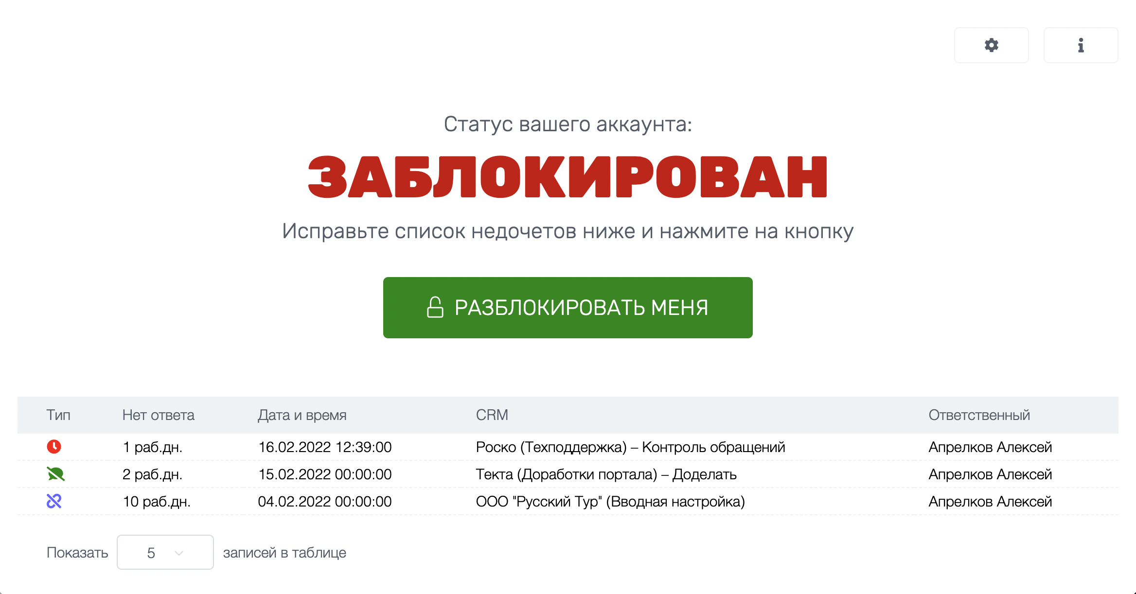 - Чтобы снять «блокировку», Сотруднику нужно будет зайти в это приложение, исправить обозначенные там недочеты и нажать на кнопку «Разблокировать меня»;
