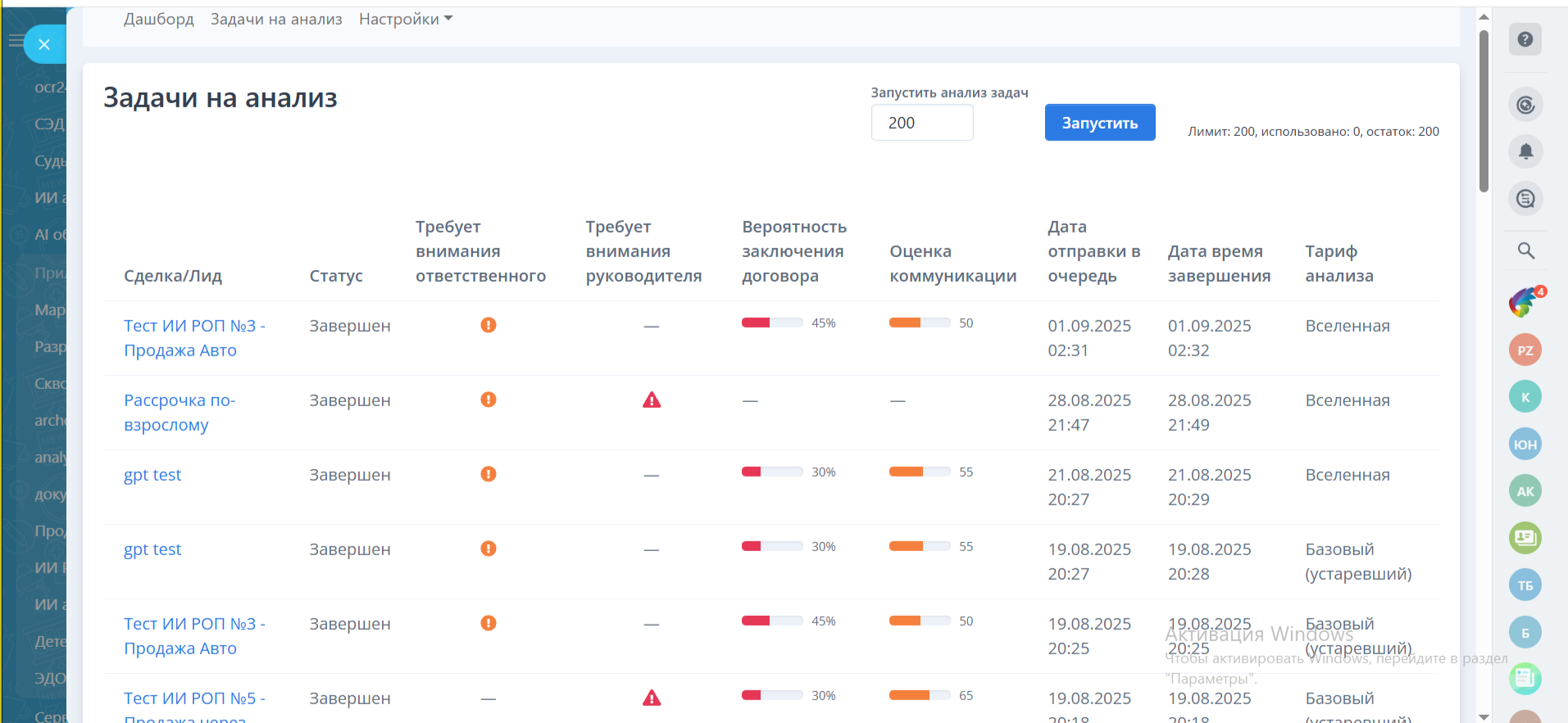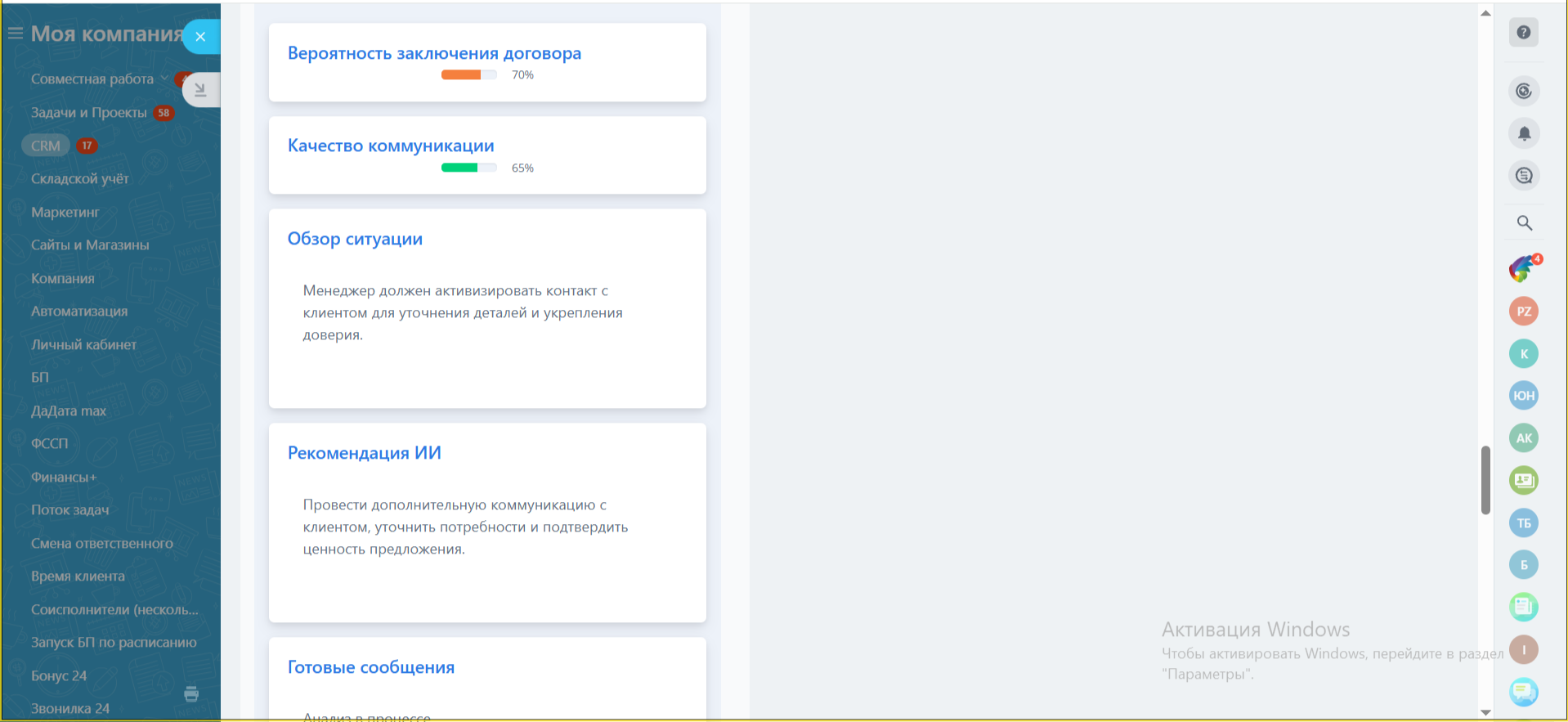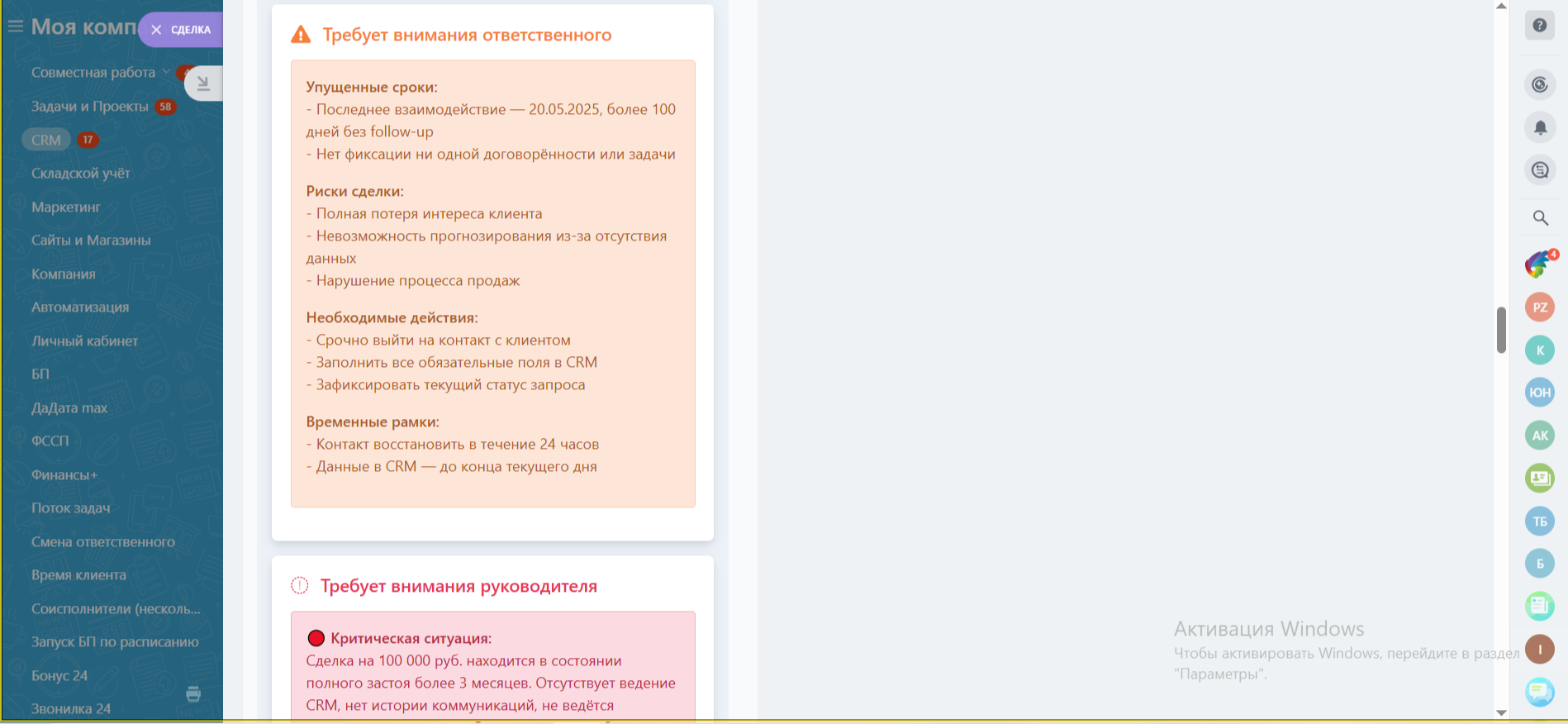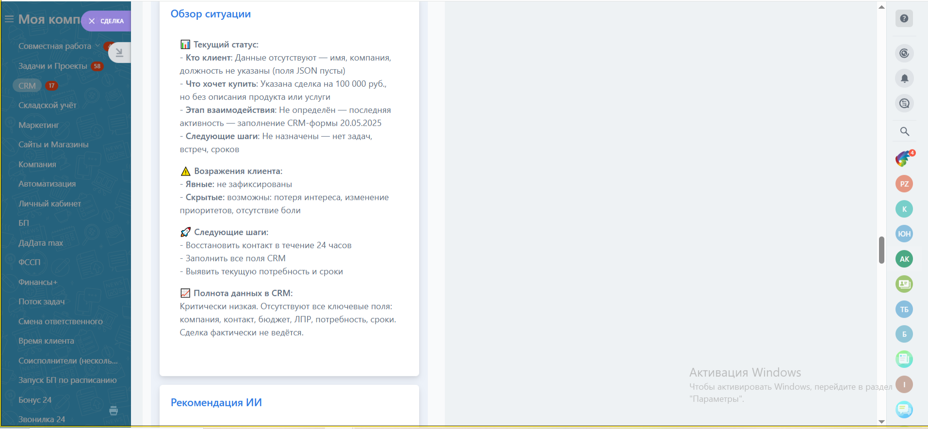 ИИ предлагает конкретные действия для каждого менеджера, основанные на глубоком анализе истории взаимодействий с клиентами. В зависимости от анализа, ИИ может давать рекомендации, такие как: