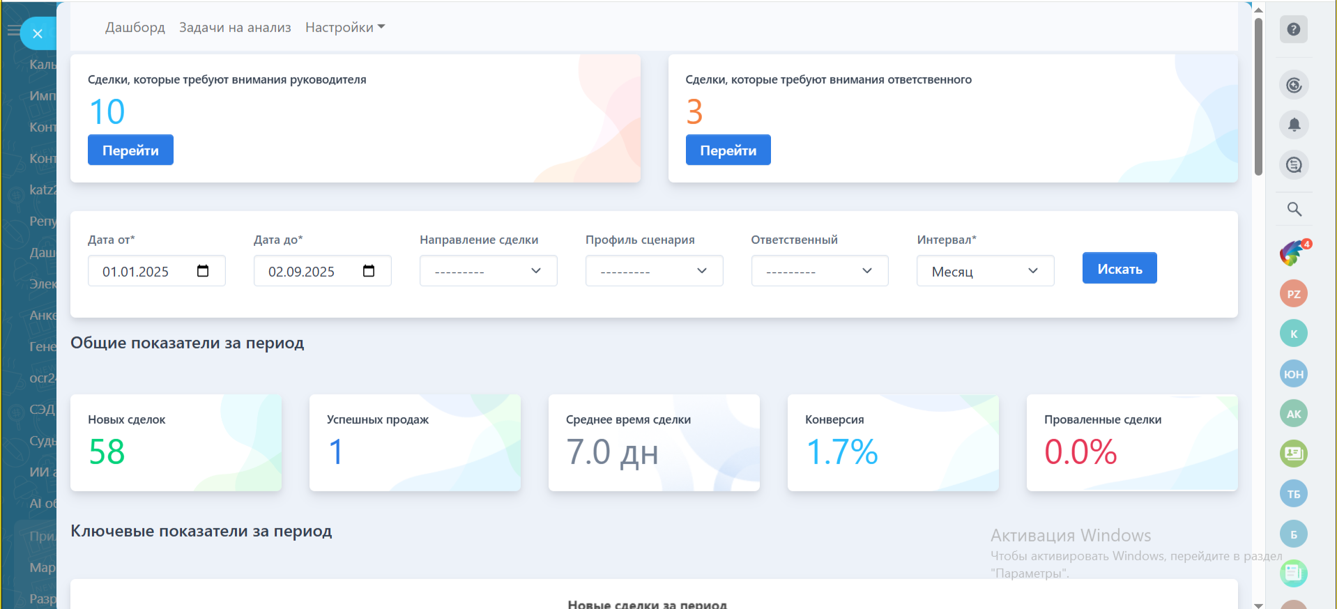 Наглядные дашборды и графикиПредоставляет полную картину эффективности отдела продаж в режиме реального времени.