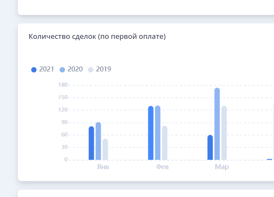 Мощные отчеты, позволяющие увидеть как динамику всего бизнеса в разрезе месяцев, недель, дней по различным показателям, так и на уровне контрагента и сделки.