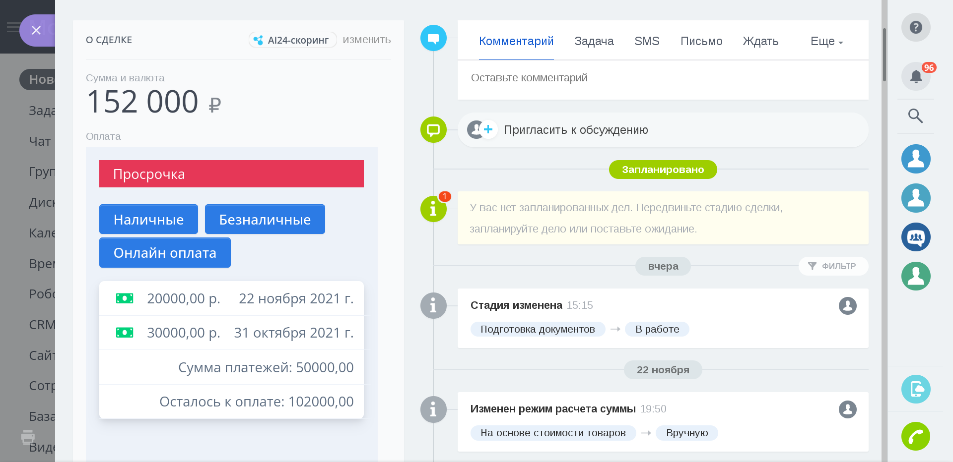 Например, вы заключили договор на ремонт квартиры, приступили к работам, а клиент должен оплачивать по 50 тысяч каждую неделю. Клиенту нужно напоминать об оплате, а если клиент просрочил платеж, работы необходимо остановить.