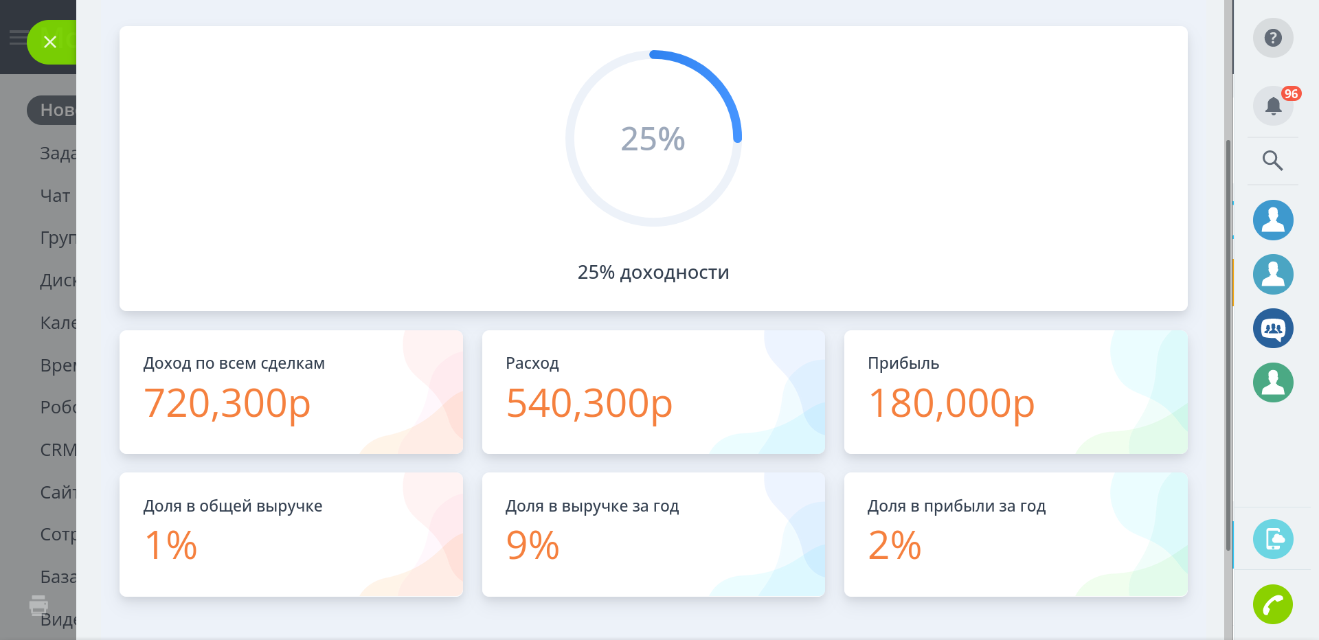 Ведите учет доходов и расходов прямо в сделках Битрикс24. Анализируйте динамику всего бизнеса или конкретных сделок и контрагентов по различным показателям.