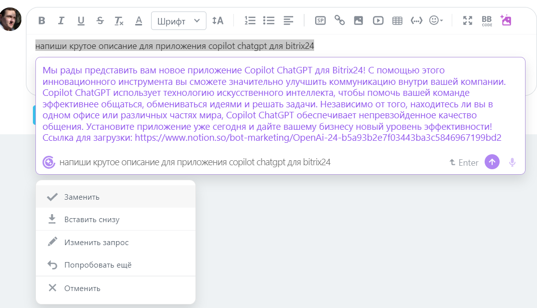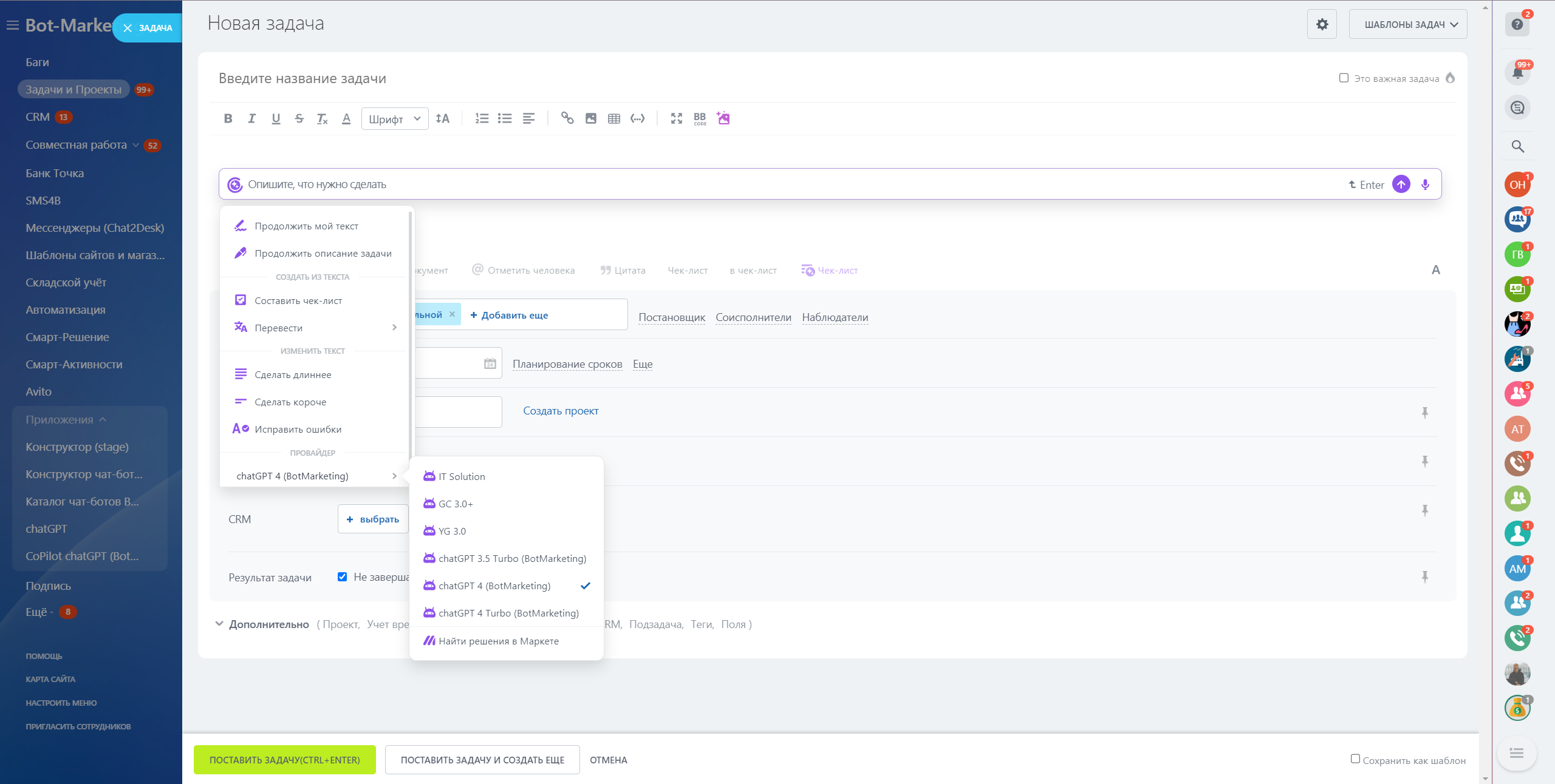 Генерировать текст вы можете в любом месте, где есть кнопка CoPilot. Вам нужно только выбрать наш провайдер из списка. Наши провайдеры всегда идут с припиской BotMarketing. Вот так вы можете выбрать наш провайдер: