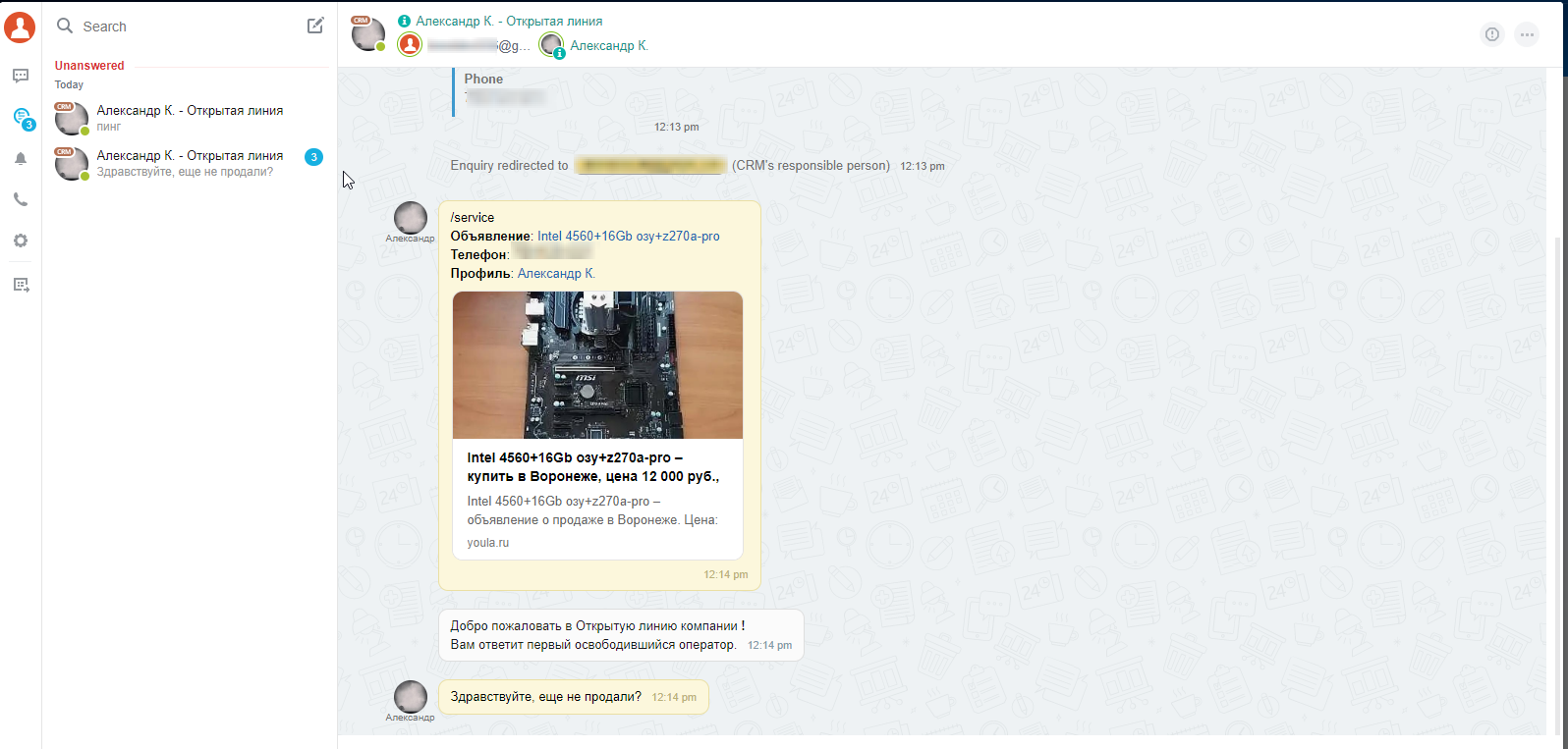 В случае написания ответного сообщения клиенту напрямую на сайте Youla.ru, данные сообщения не будут отображены в открытых линиях Bitrix24.