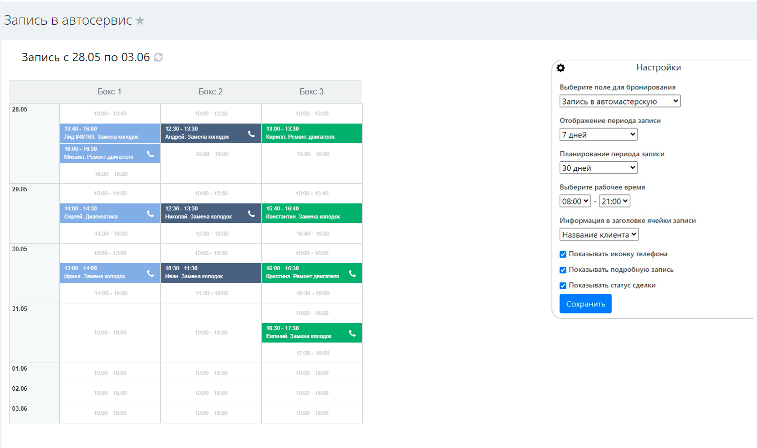 В созданной сущности CRM вы можете прикрепить существующий Контакт из CRM. В таком случае в шахматке будет отображаться фамилия, имя и телефон контакта.