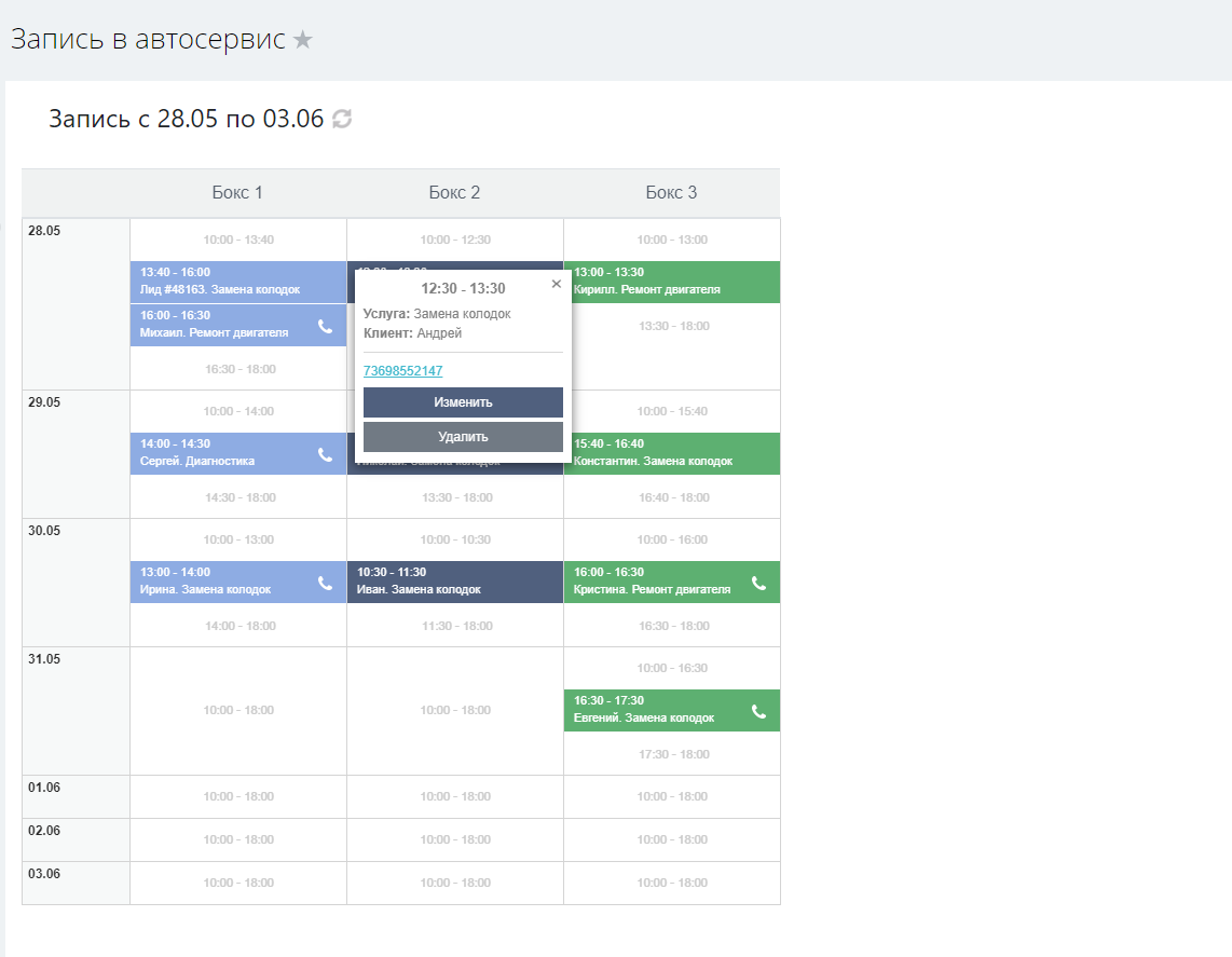 Для изменения данных записи на услугу (изменение времени или смена бокса/поста) нажмите «Изменить».