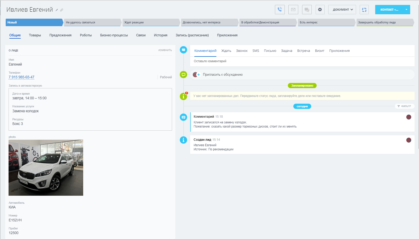 Например: Евгений, замена тормозных колодок, среда 29 мая в 14:00.
