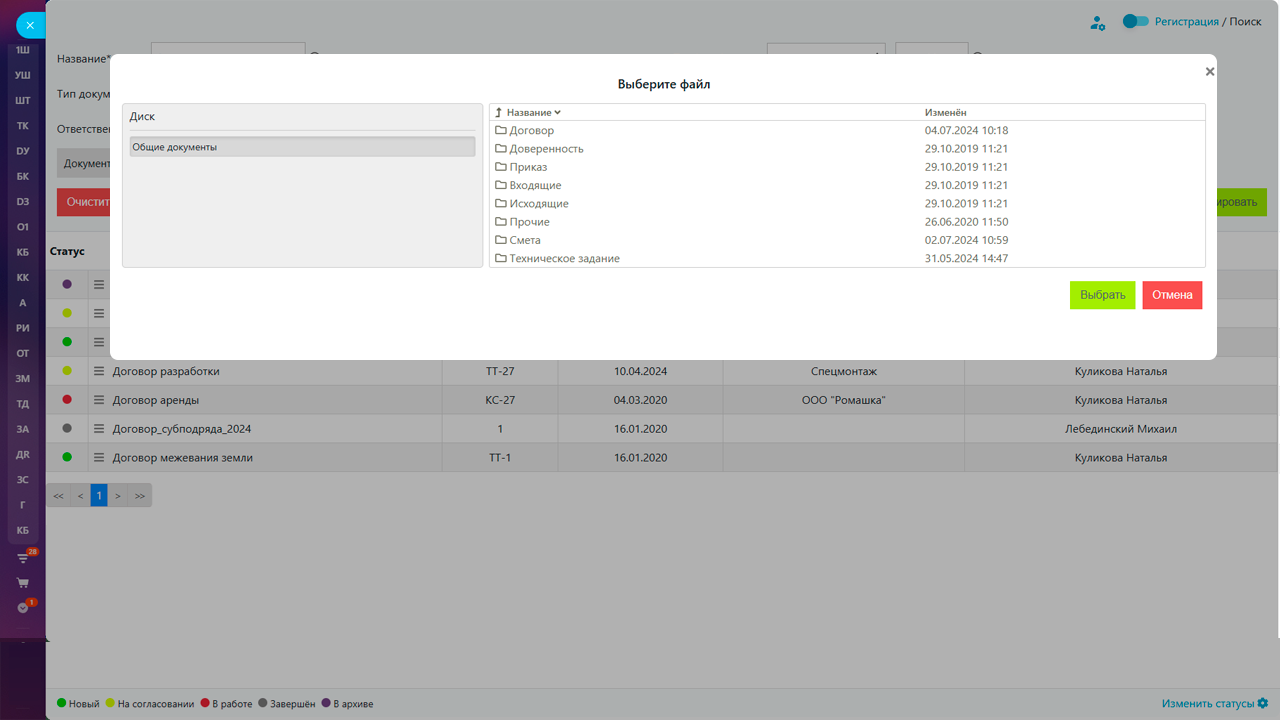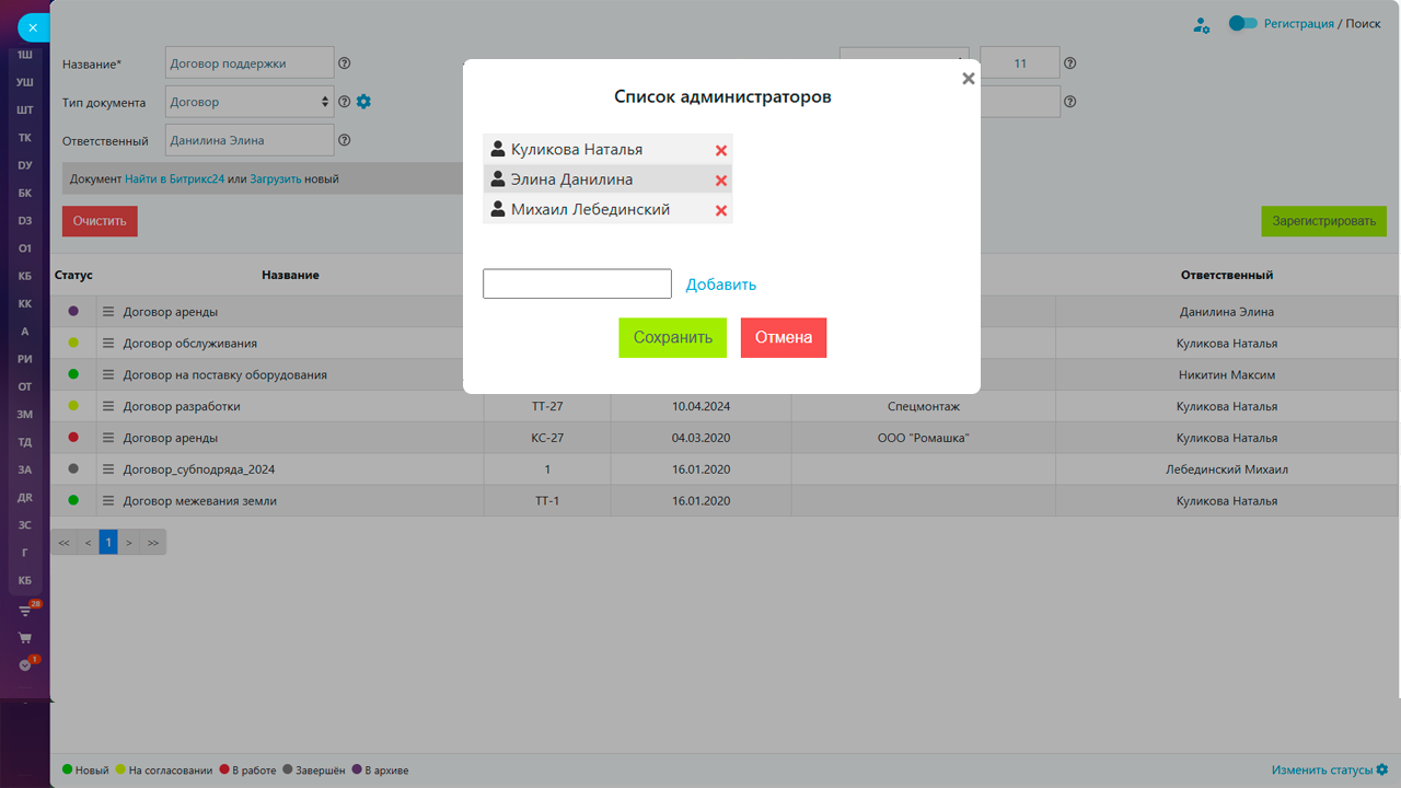 Многие пользователи хотят внедрить систему документооборота. Воспользуйтесь Моими документами, устанавливайте статусы на каждый документ, а также ответственного сотрудника за этот статус. Вы можете расширить предлагаемый по умолчанию набор статусов и настроить визуальное представление (цвета). Таким образом, использование статусов и ответственного за документ позволяет настроить несложную систему документооборота.