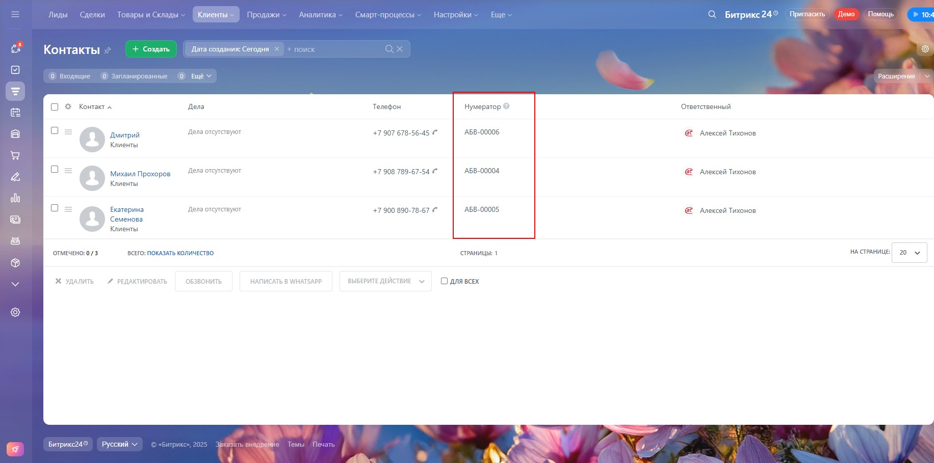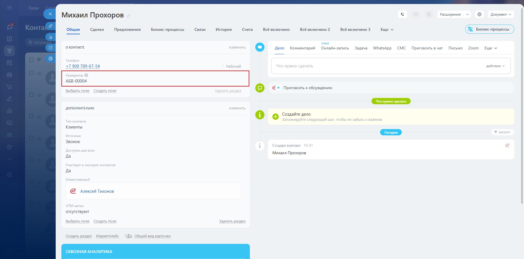 При создании нового лида, сделки или контакта нумератор будет автоматически присваивать следующий номер.