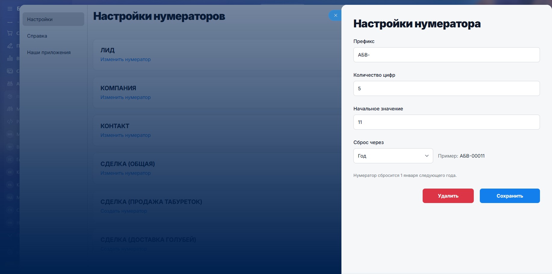 Префикс - статическая часть, добавляемая в начало каждого номера. Например, DL- для сделок или CL- для клиентов. Помогает визуально различать типы номеров.Количество цифр - определяет длину числовой части нумератора. Если указано, например, 4, то номера будут формироваться как 0001, 0002 и т.д.