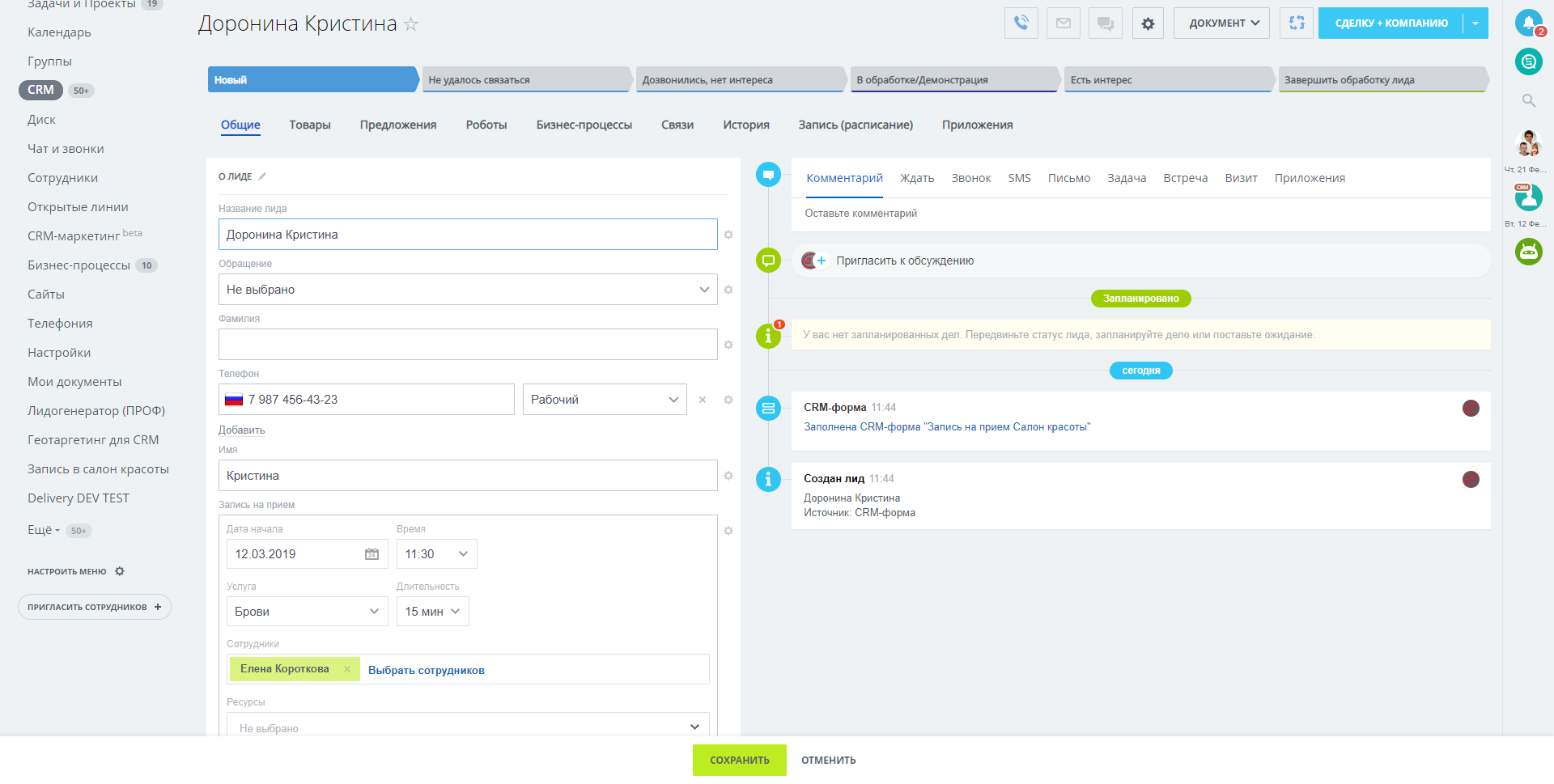 Всё просто! Создайте сущность (Лид или Сделка) и укажите время записи, услугу и сотрудника.