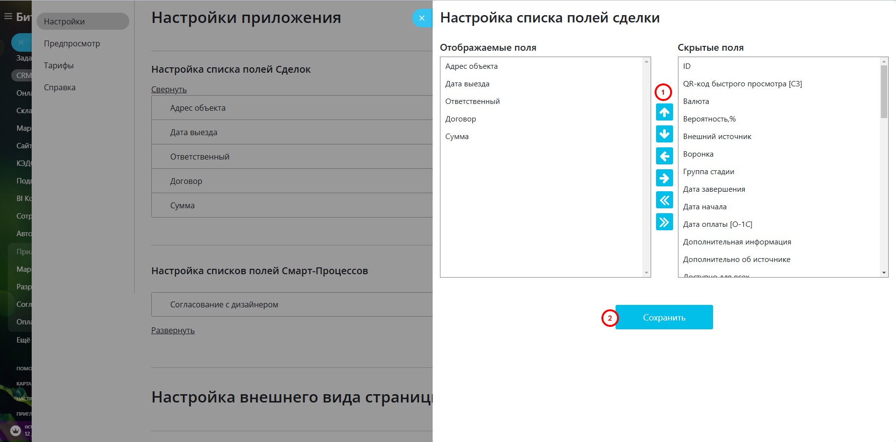 1. Настройка приложения позволит выбрать воронку для базового тарифа и настроить поля отображения для всех воронок или для всех смарт-процессов.