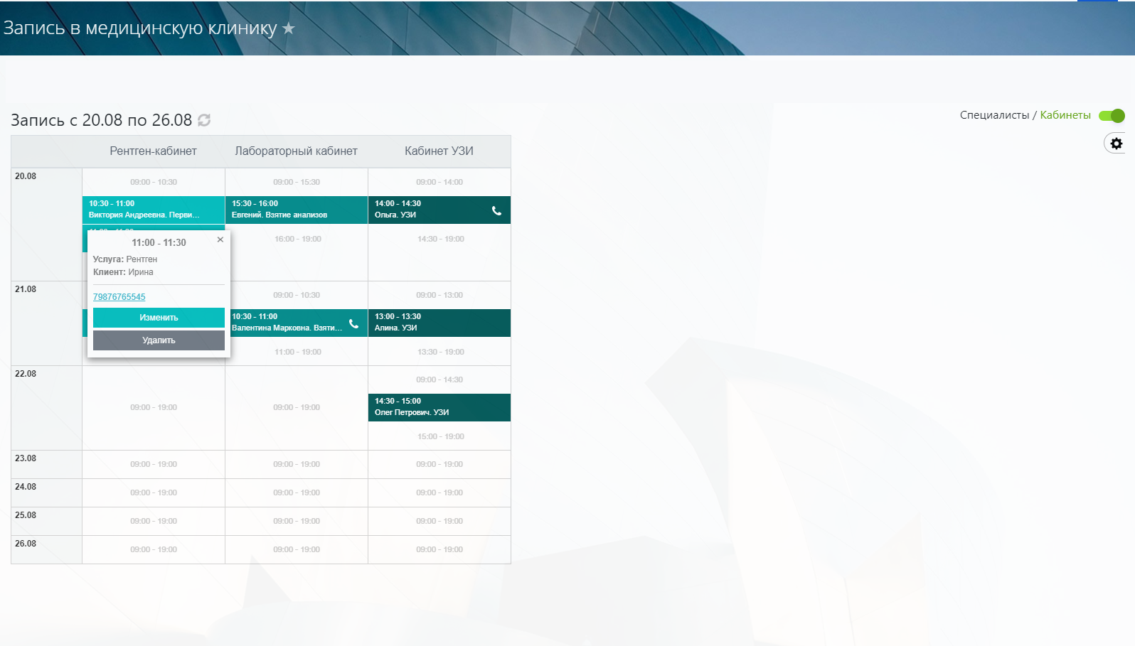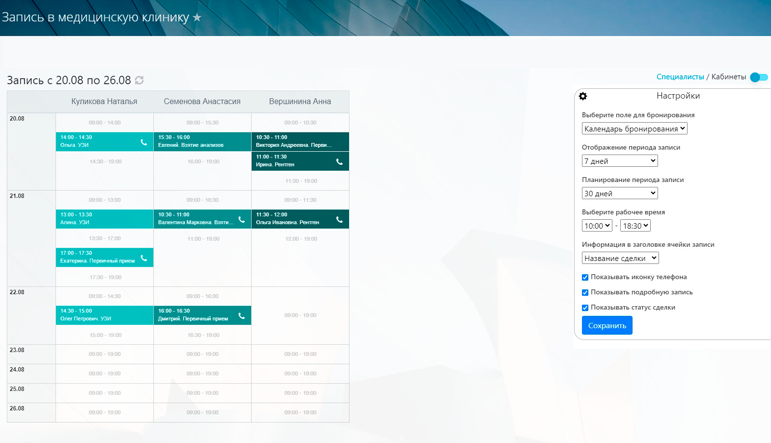 Важно: это приложение позволяет отображать записи на услугу как в разрезе специалистов, так и в разрезе кабинетов.