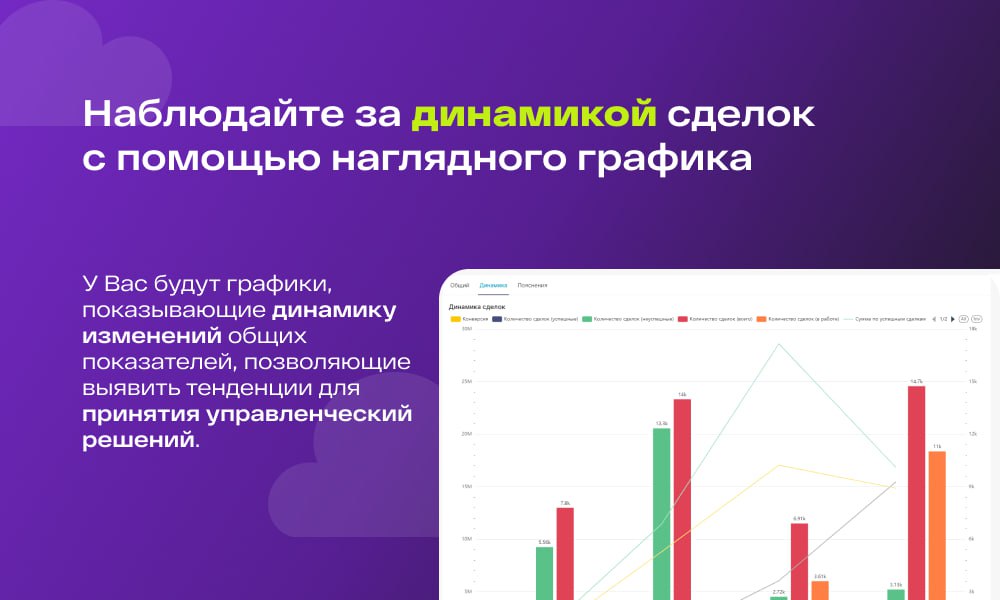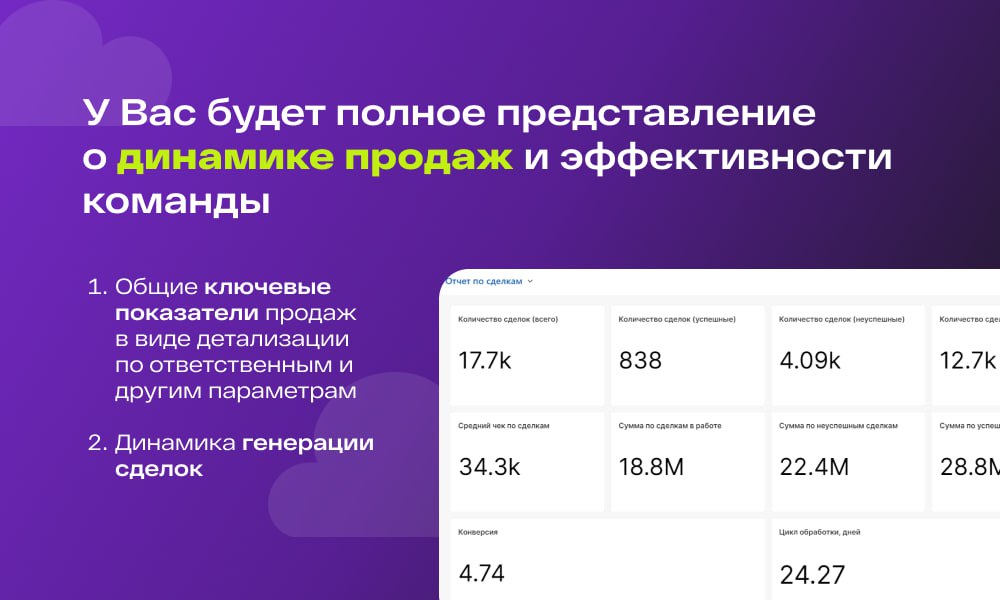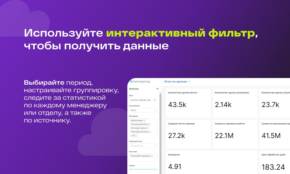 Подробная аналитика продаж по сделкам с помощью BI-конструктора: визуализация данных, аналитика, KPI, прогнозы и развитие продаж, динамика показателей.
