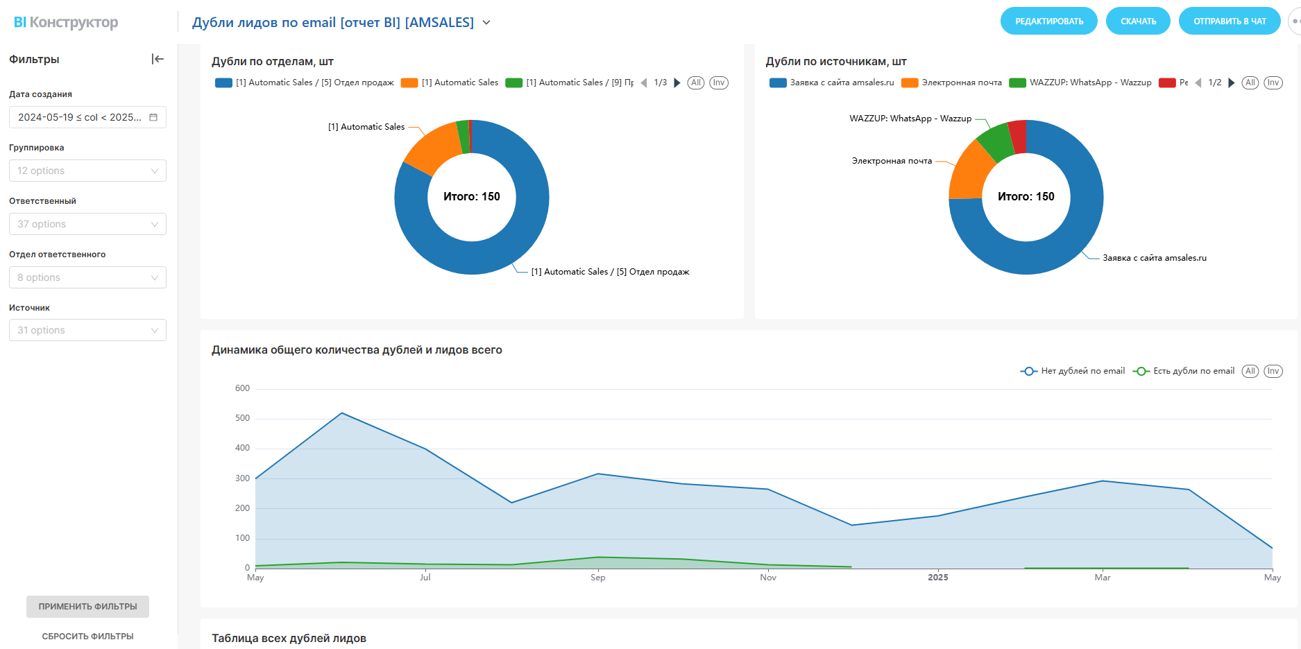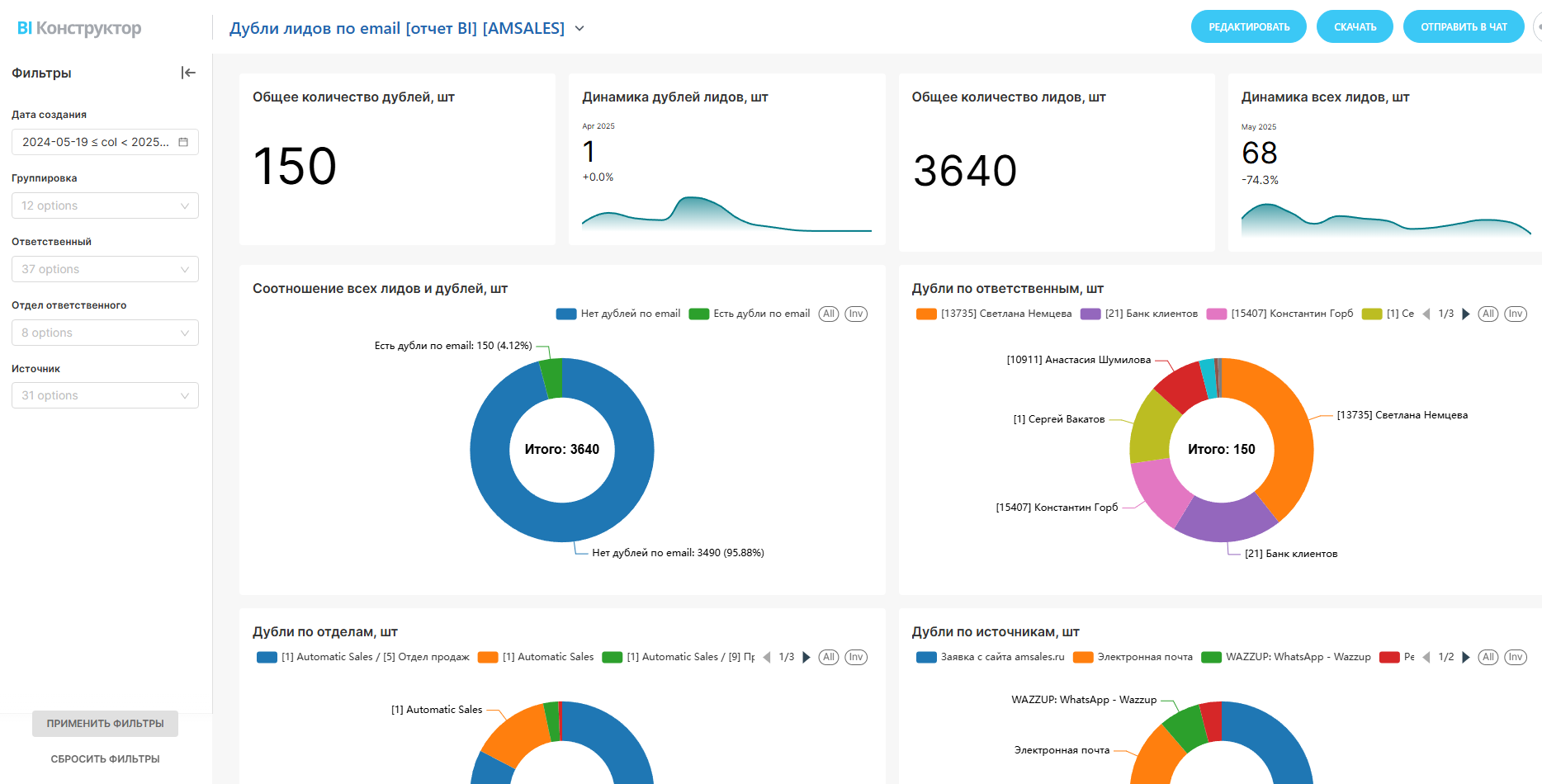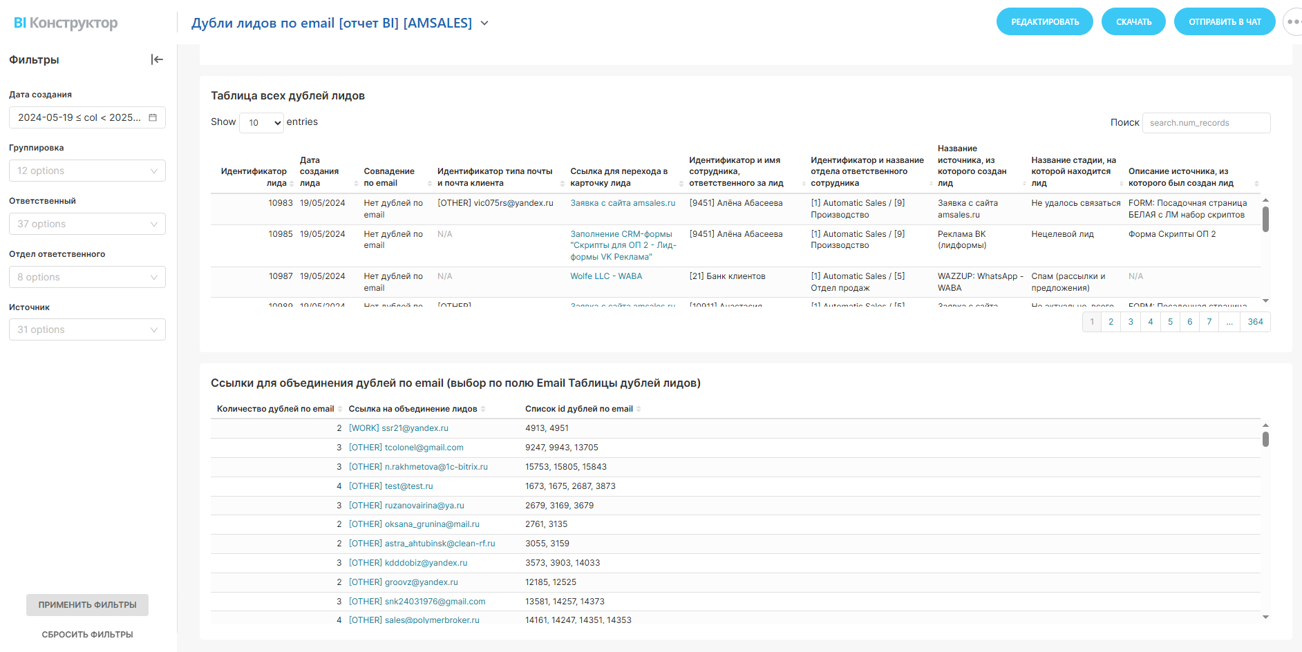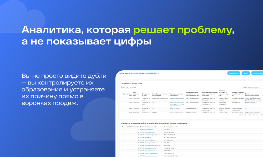 С помощью отчета "BI-отчет: Дубли лидов по email в CRM" вы сможете:
