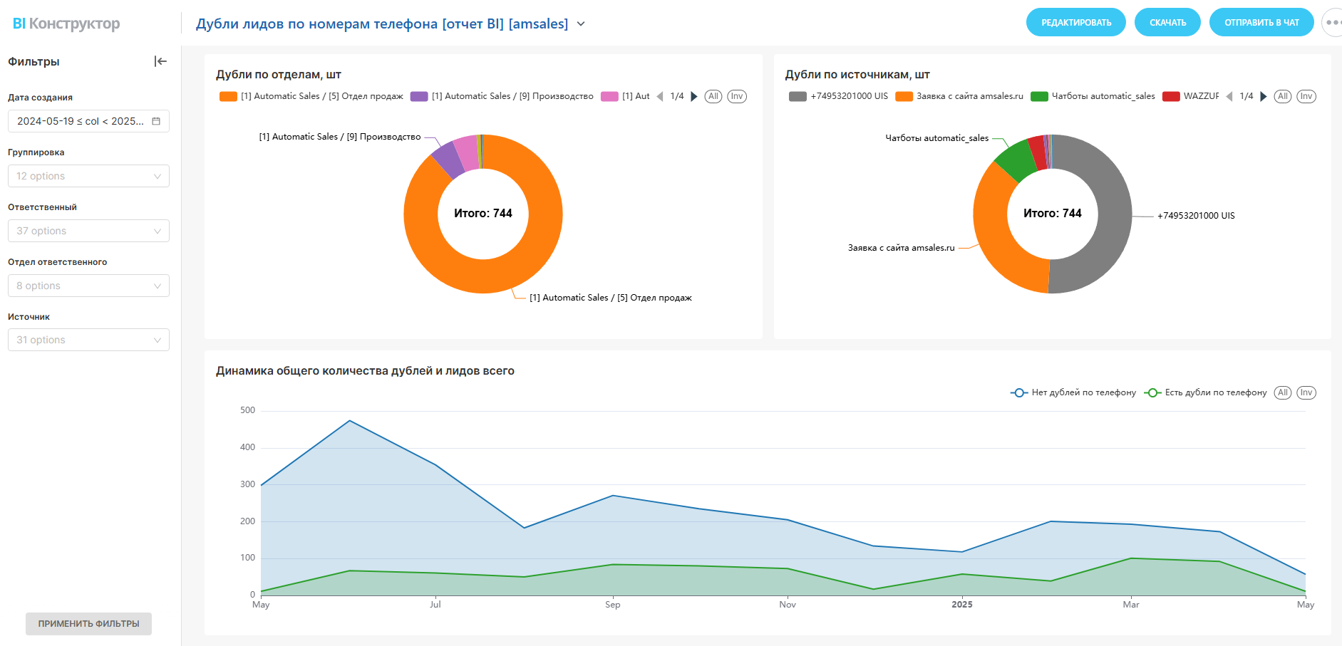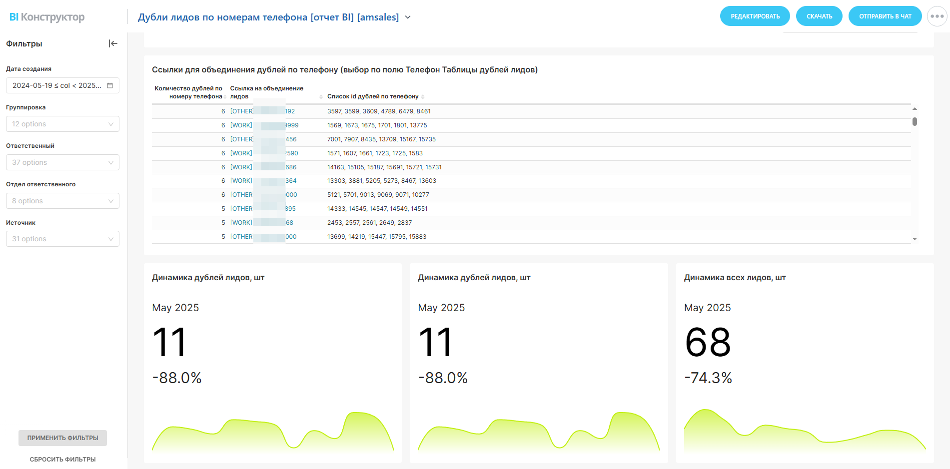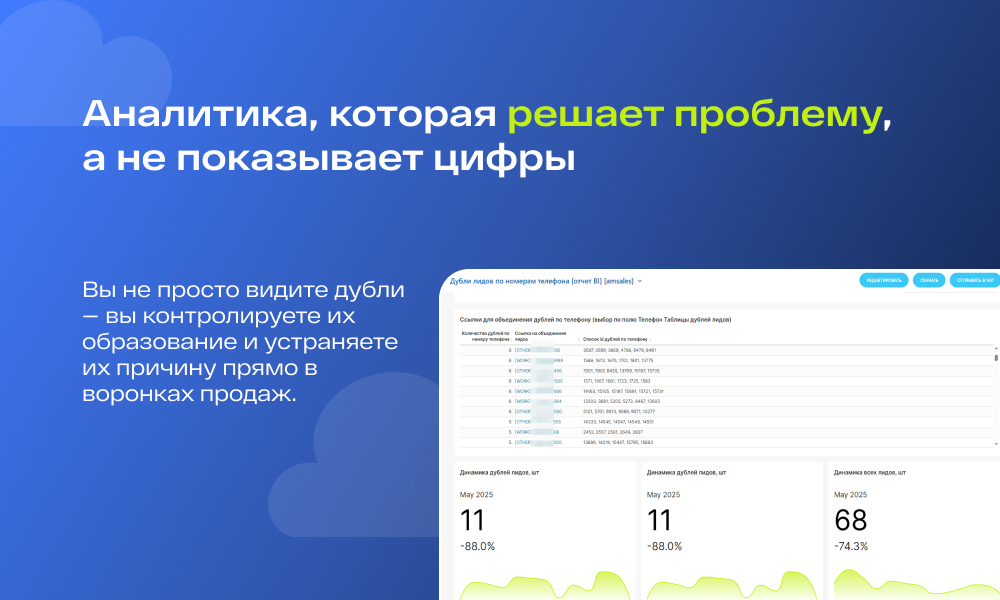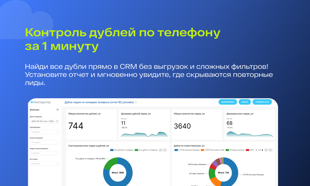 С помощью нашего отчета "BI-отчет: Дубли лидов по телефону в CRM" вы сможете: