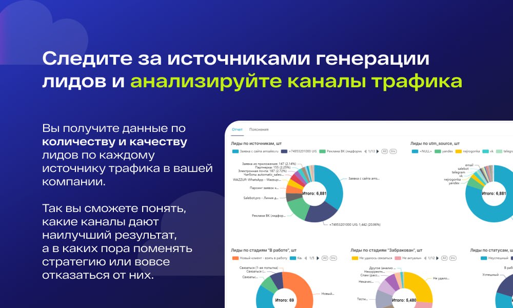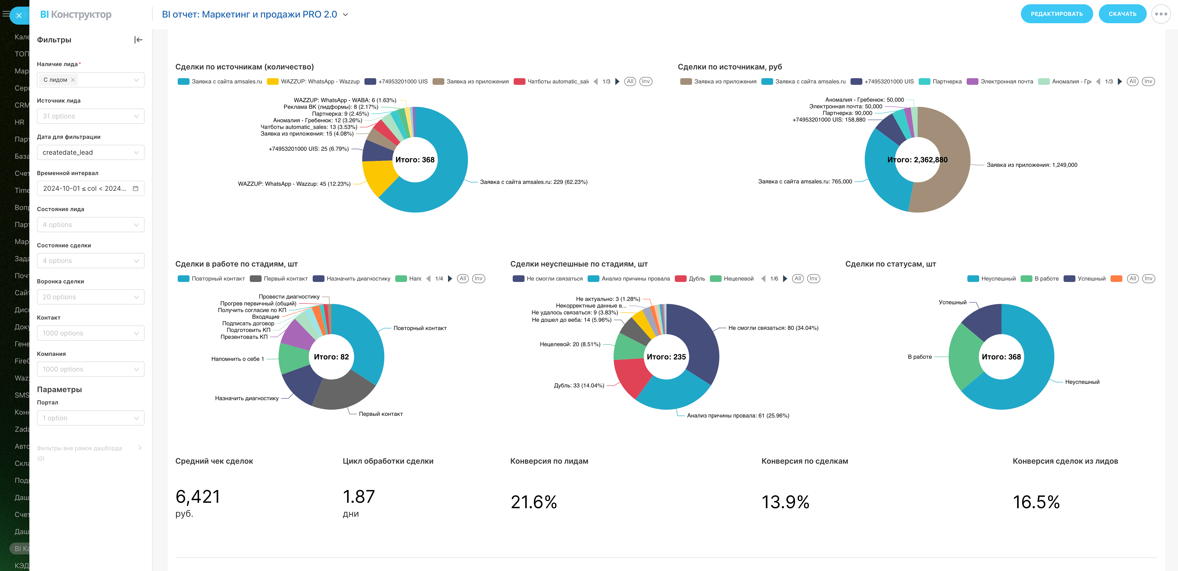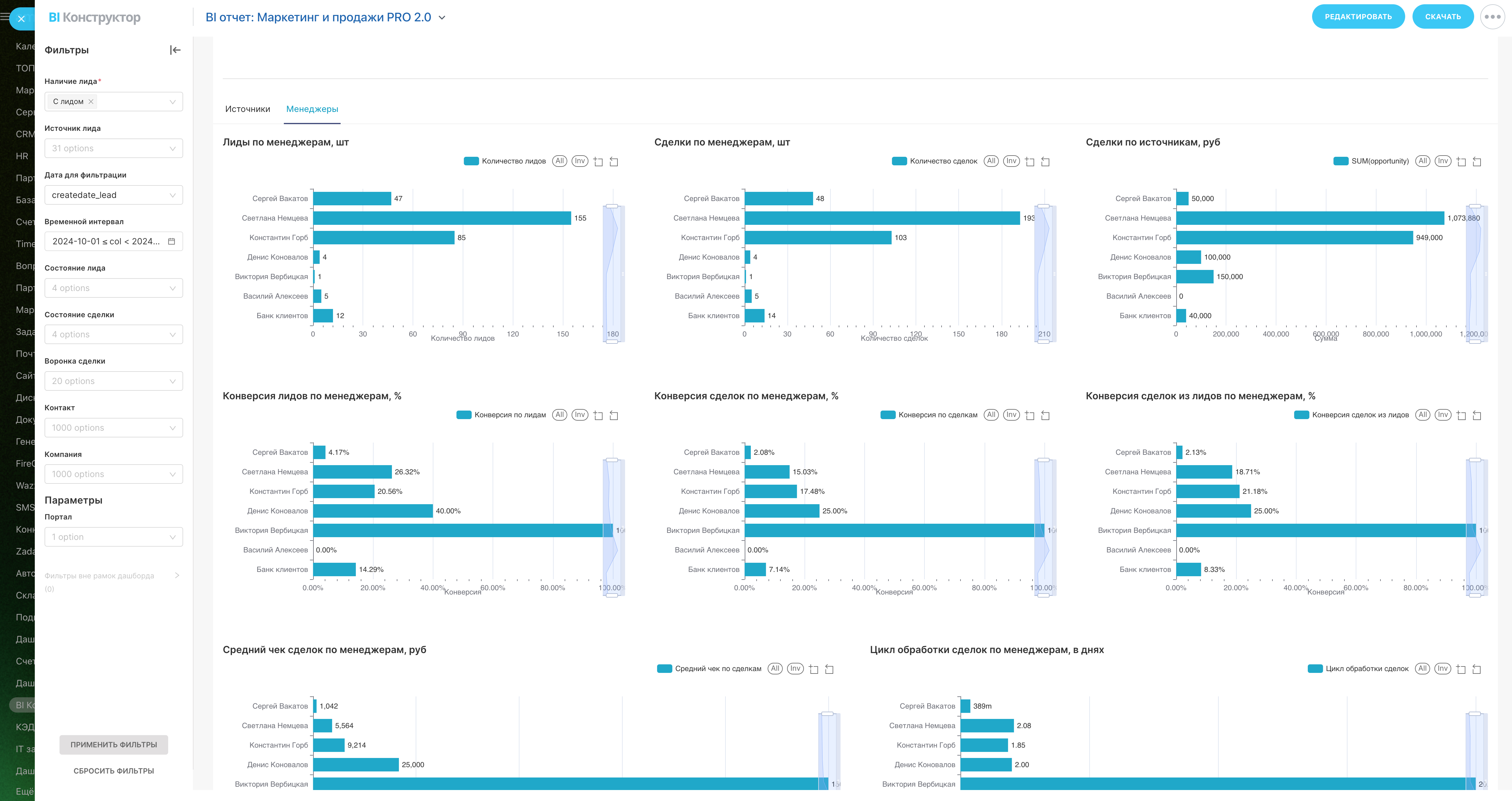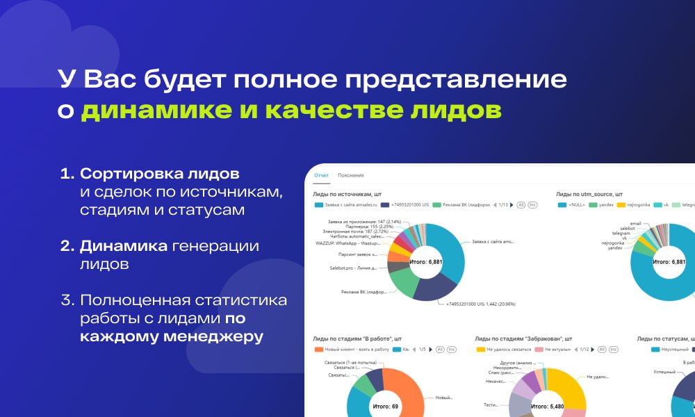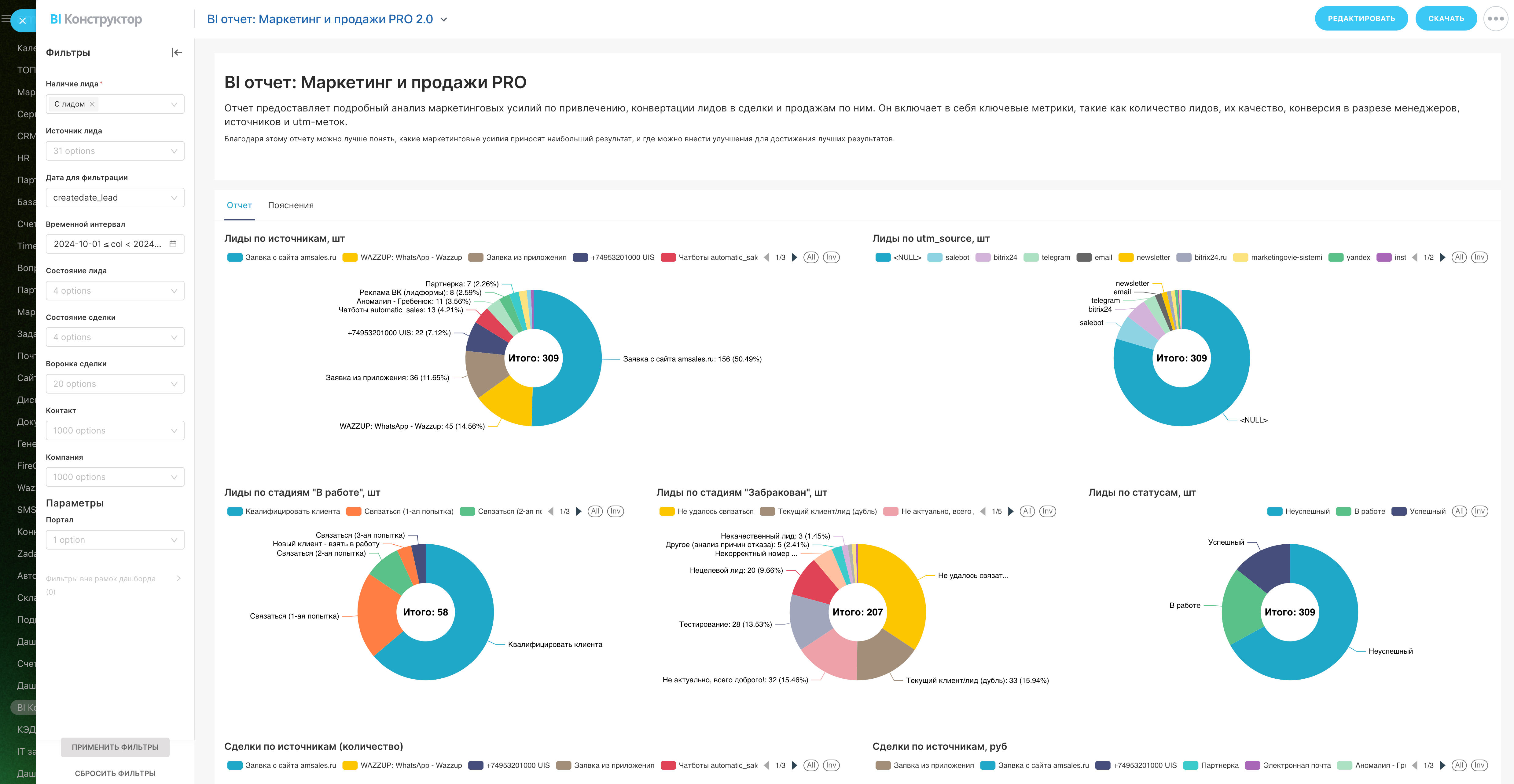Аналитический дашборд для визуализации данных и аналитики ключевых показателей, связанных с маркетингом и продажами, от привлечения новых клиентов в лидах до завершения работы со сделками в успешными и не только вариантах.