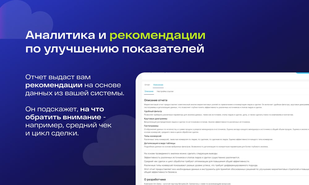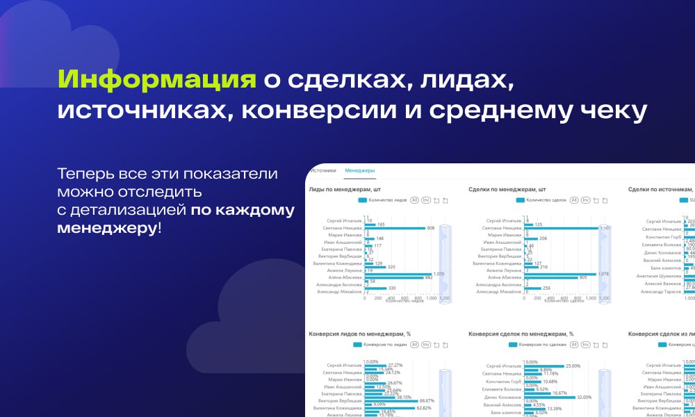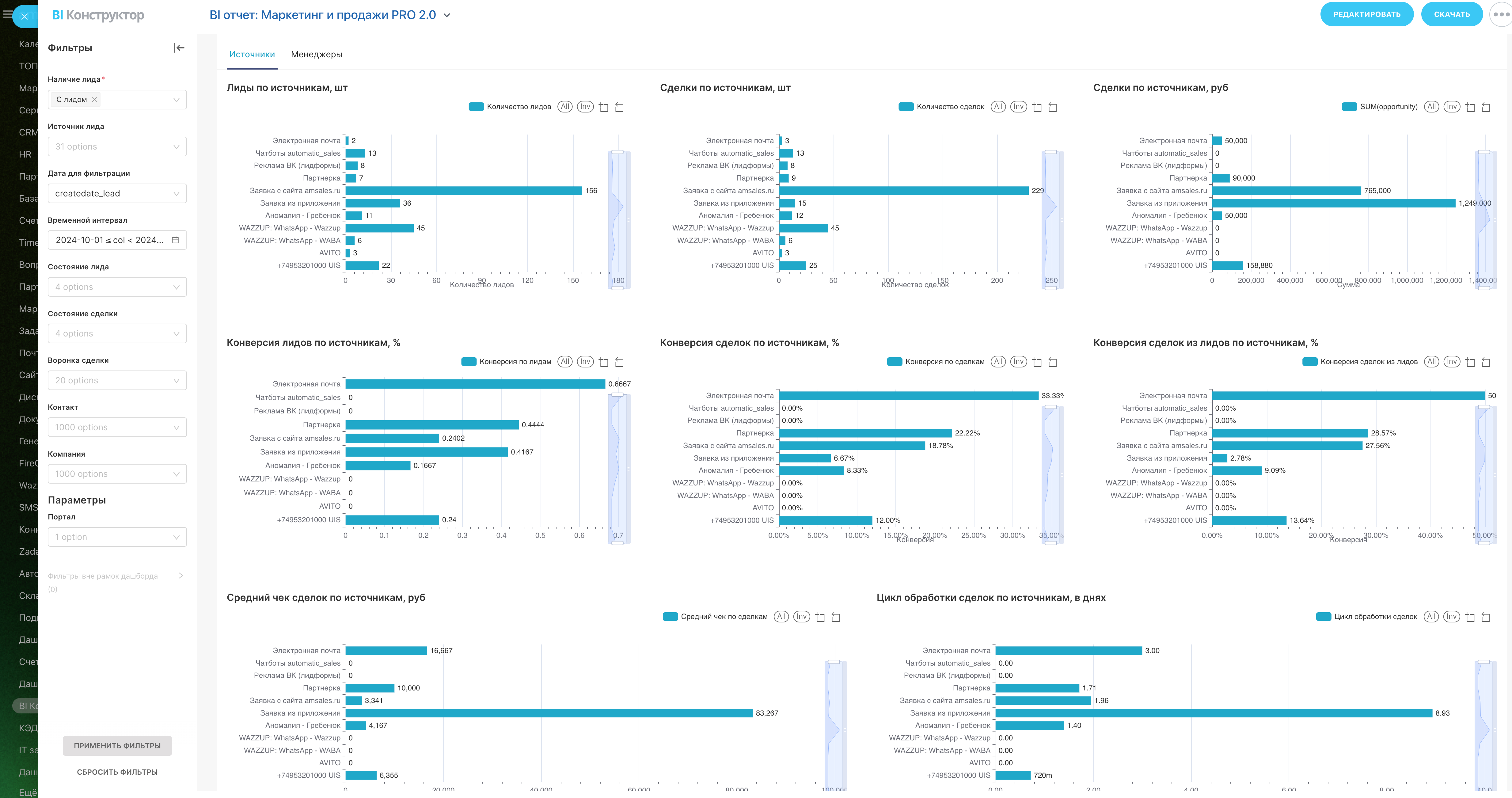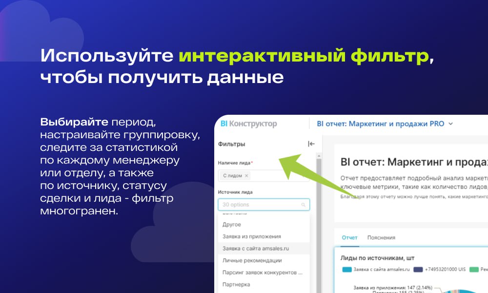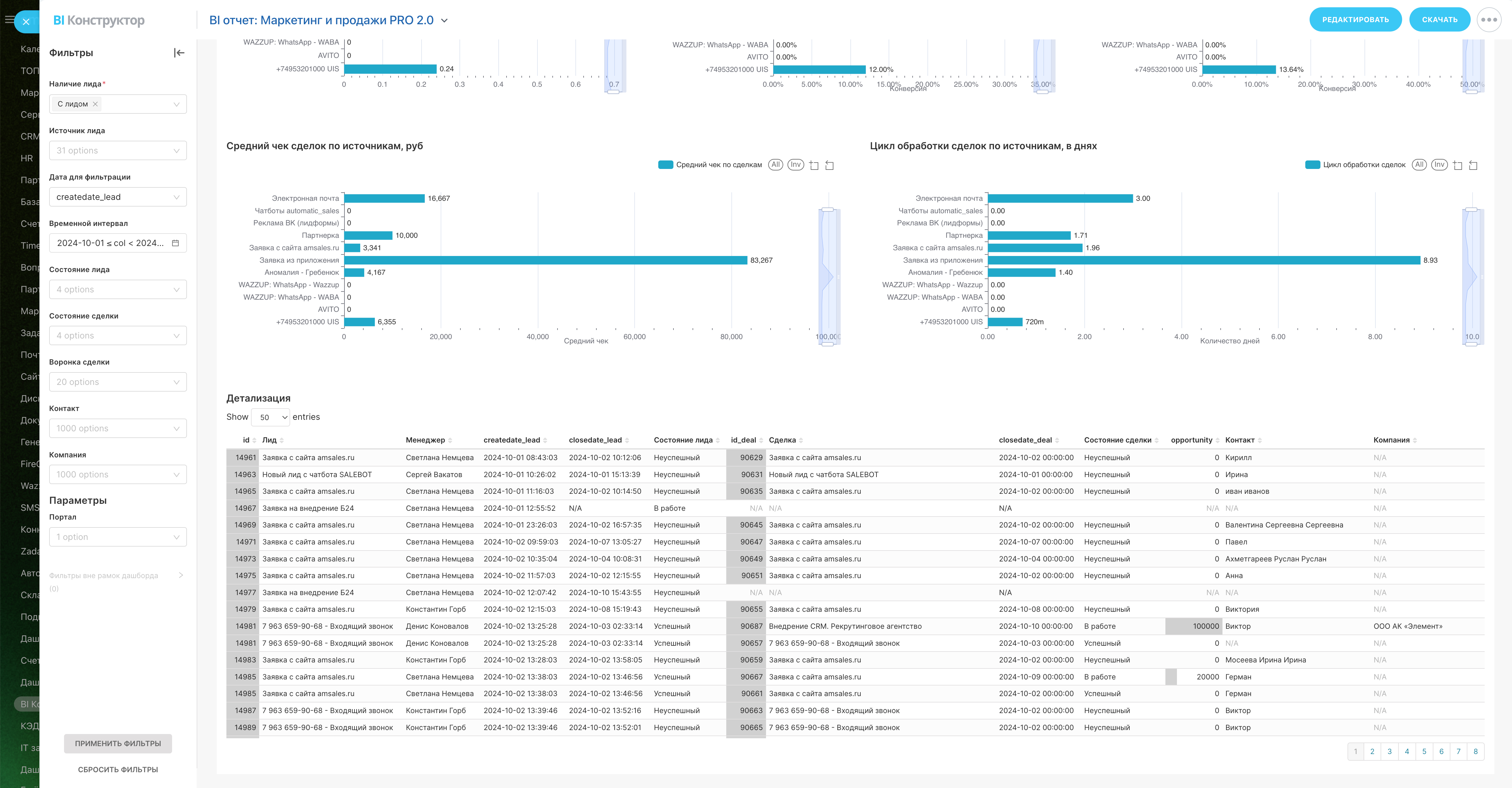 Аналитический дашборд для визуализации данных и аналитики ключевых показателей, связанных с маркетингом и продажами, от привлечения новых клиентов в лидах до завершения работы со сделками в успешными и не только вариантах.