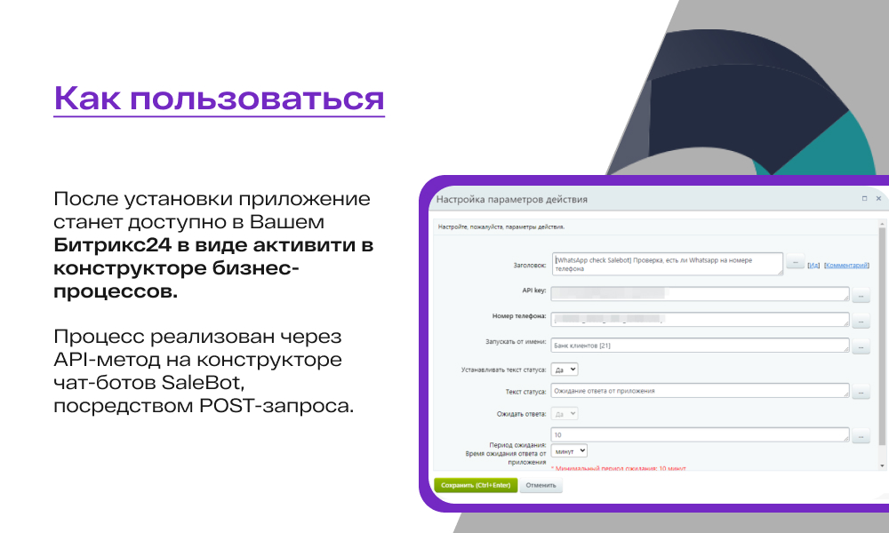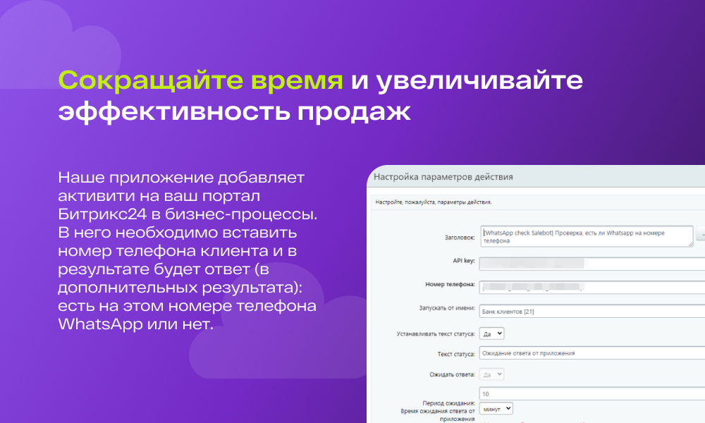 Приложение “Проверка WhatsApp” добавляет активити на портал Битрикс24 в бизнес-процессы, в который нужно вставить номер телефона клиента, где в результате будет ответ: есть на этом номере телефона WhatsApp или нет.