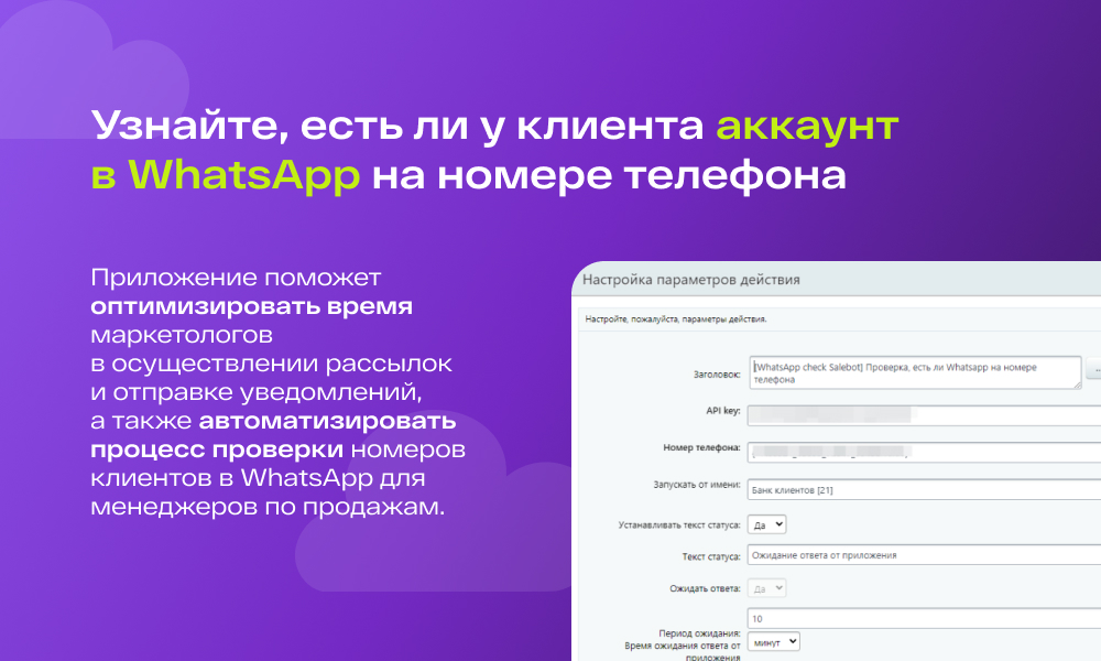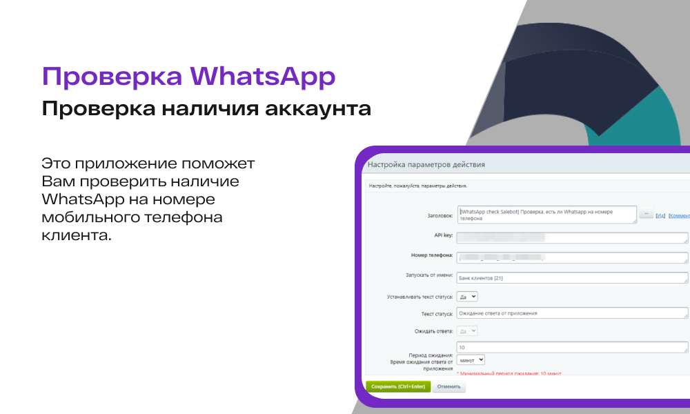 Приложение “Проверка WhatsApp” позволяет проверить наличие WhatsApp на номере мобильного телефона клиента.