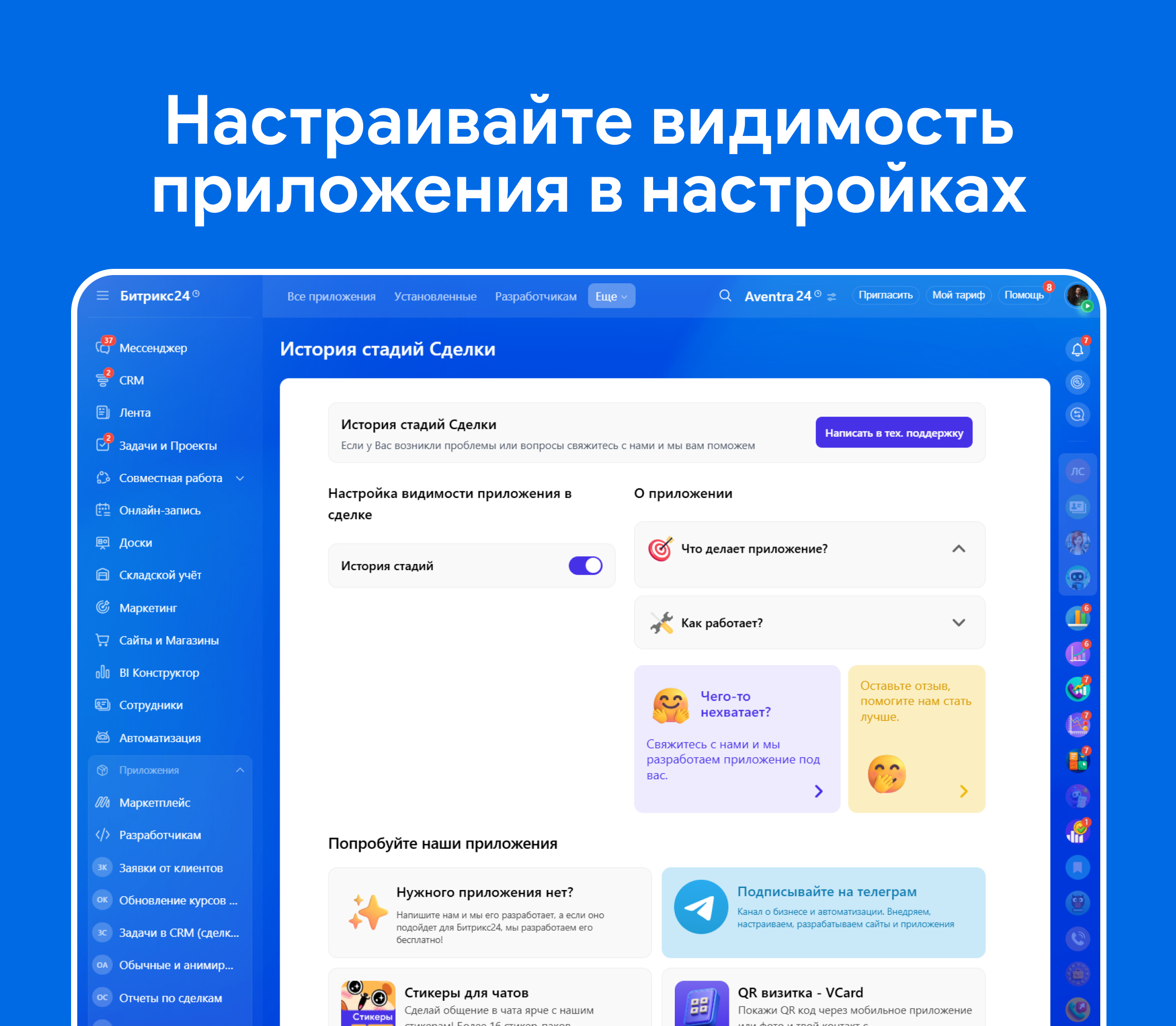 Поддерживаются облачные и коробочные порталы Битрикс24 с CRM и установкой приложений