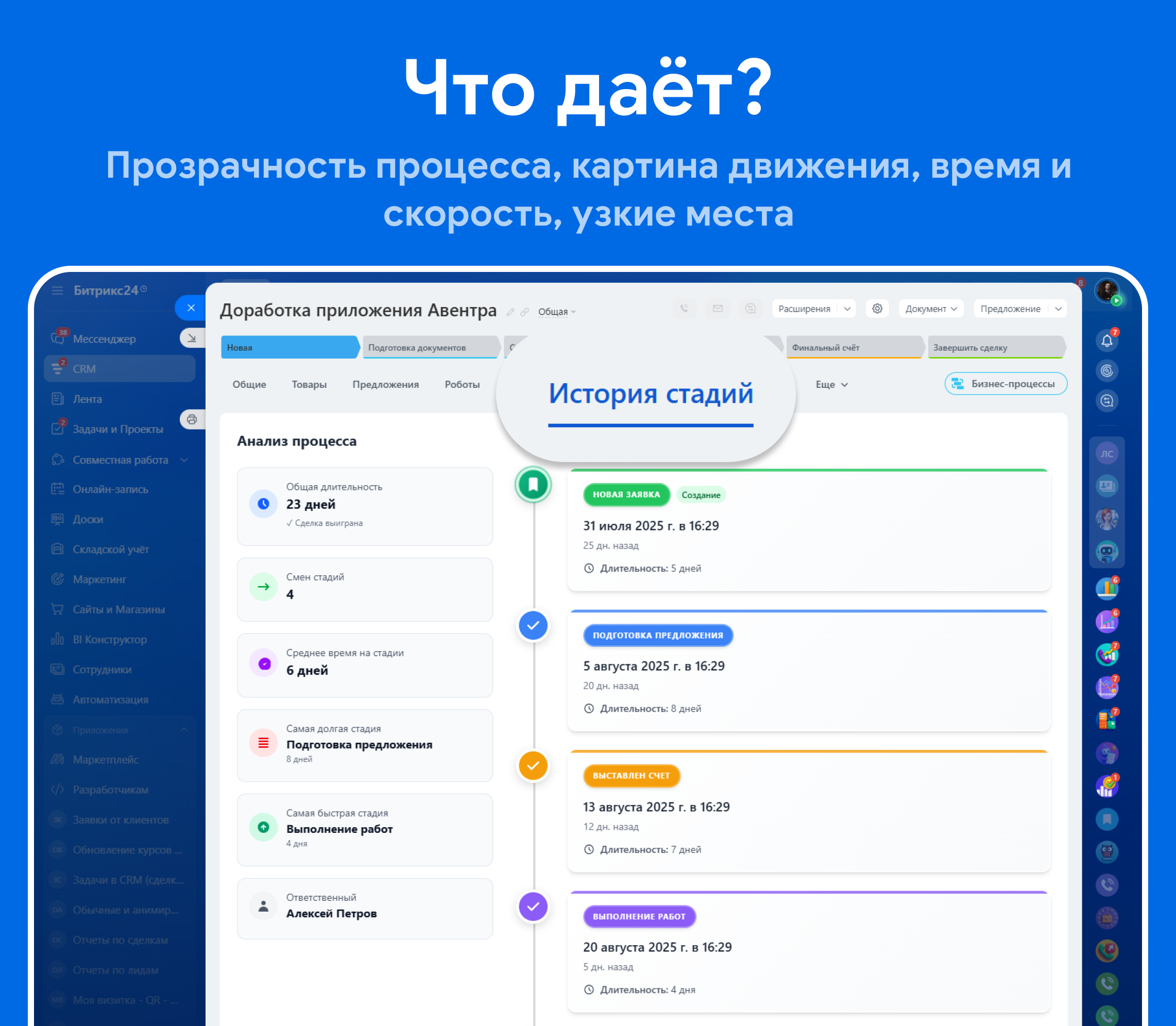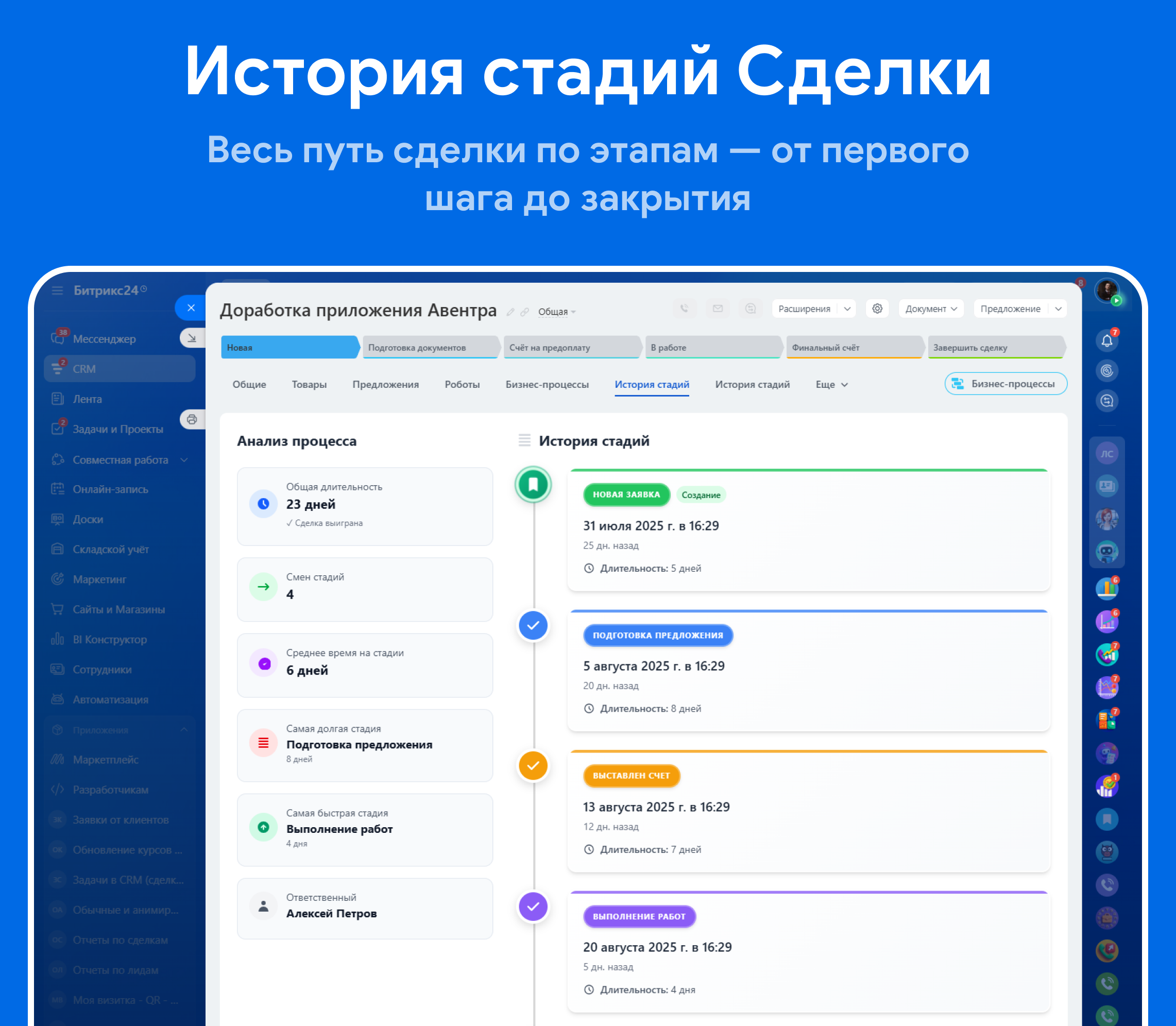 Весь путь сделки по этапам — от первого шага до «Успешно/Неуспешно» — в одном таймлайне и с понятными метриками.