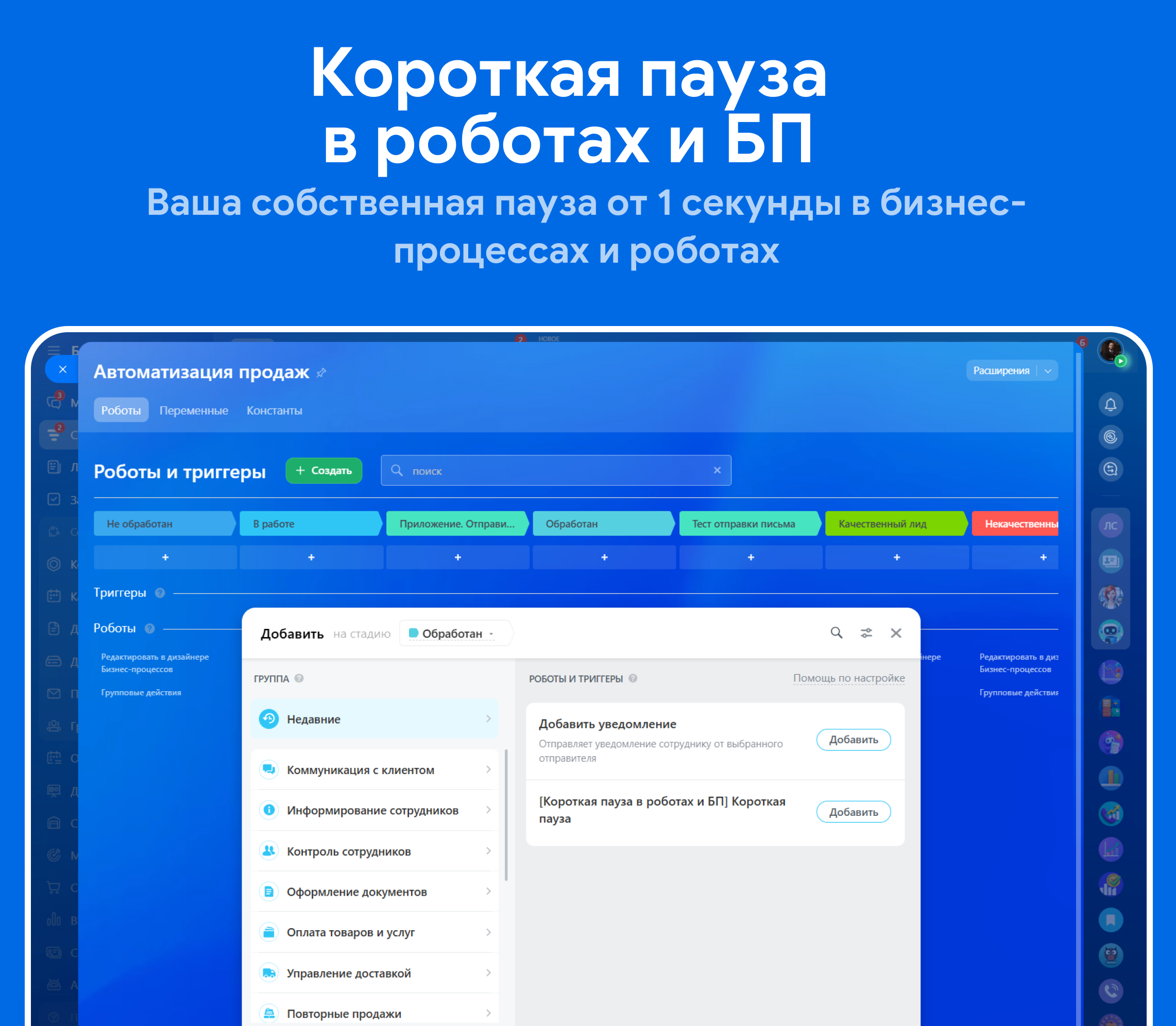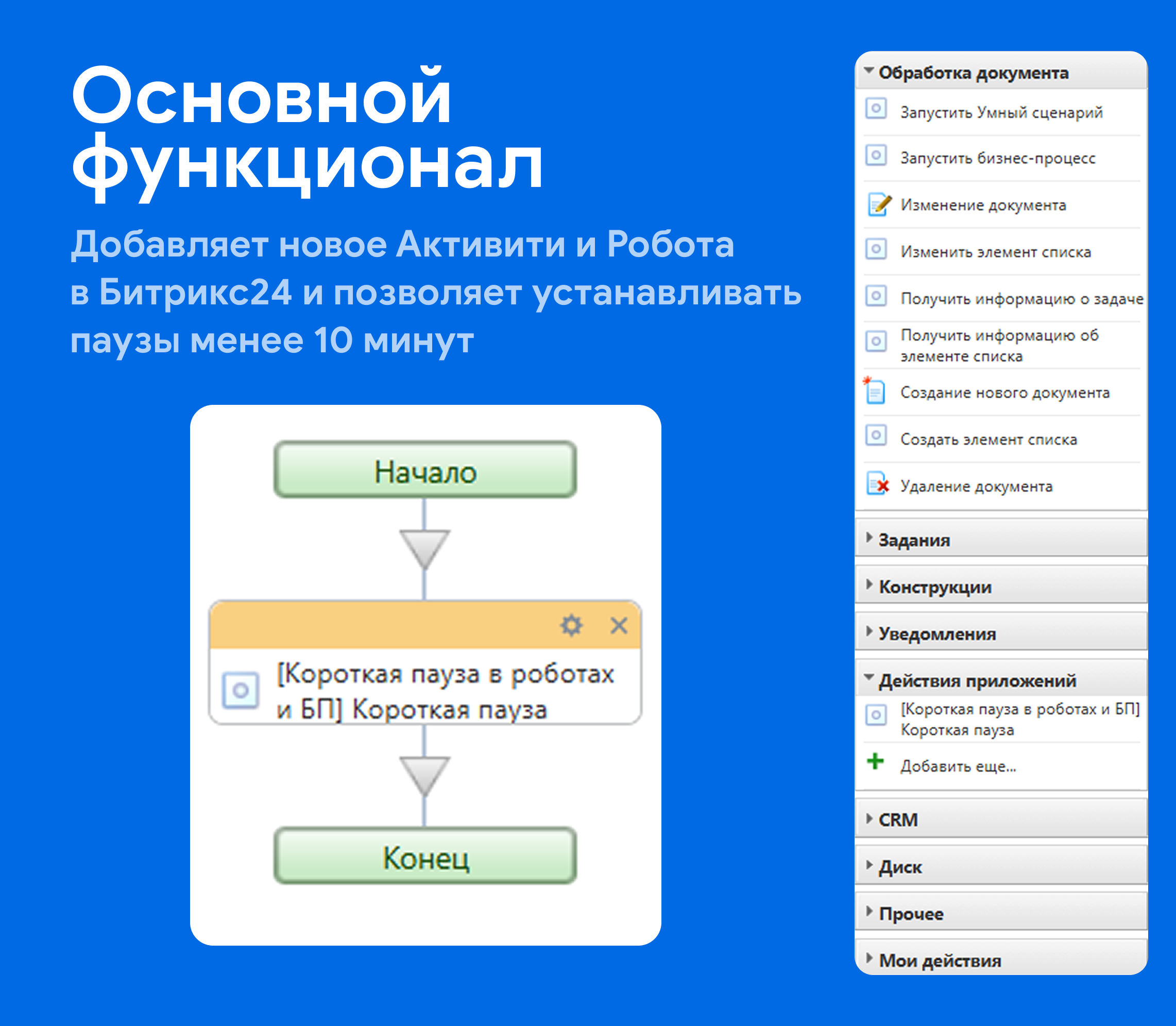 - Для задержек 10 минут и более рекомендуется использовать стандартный функционал Битрикс24.