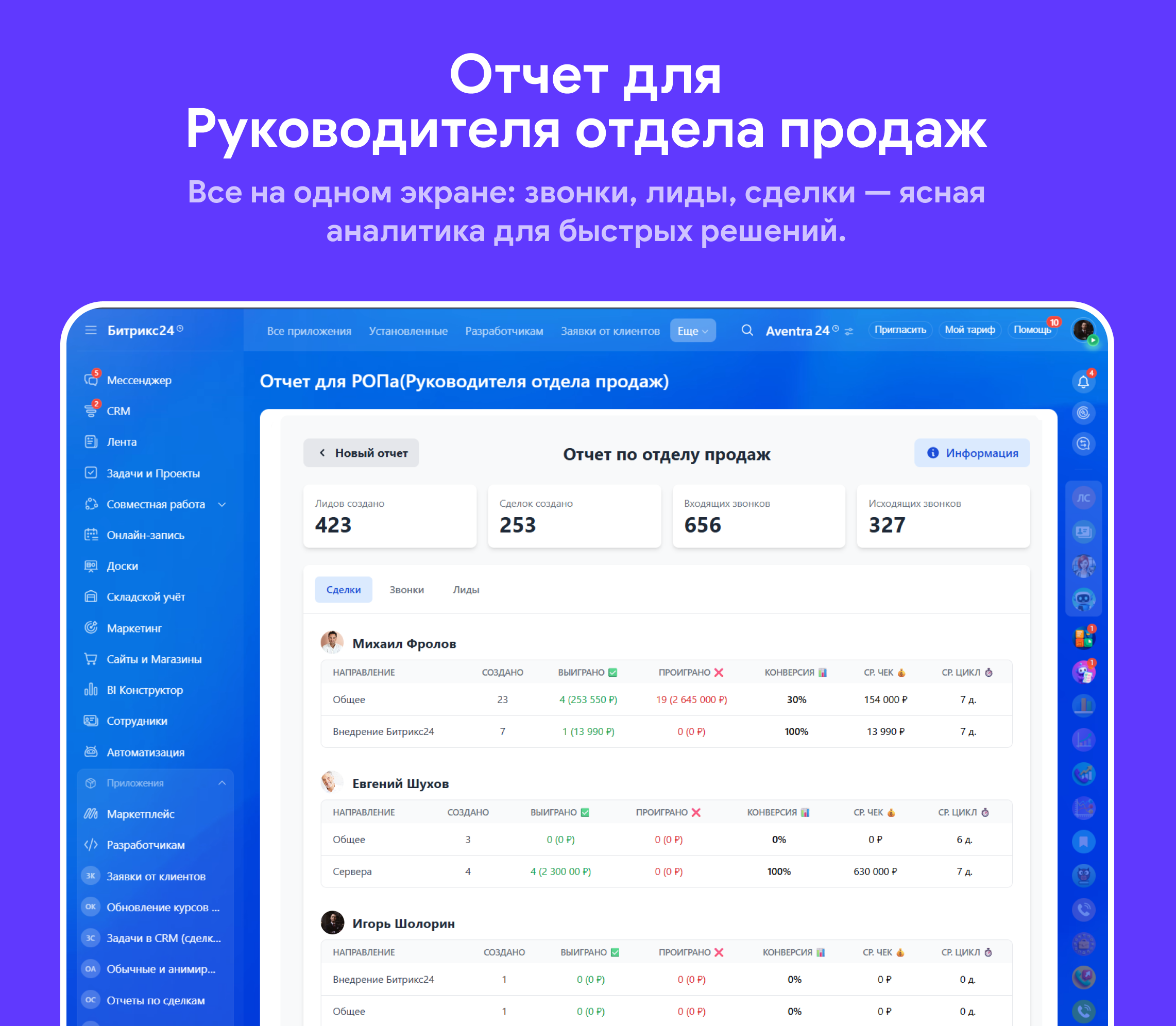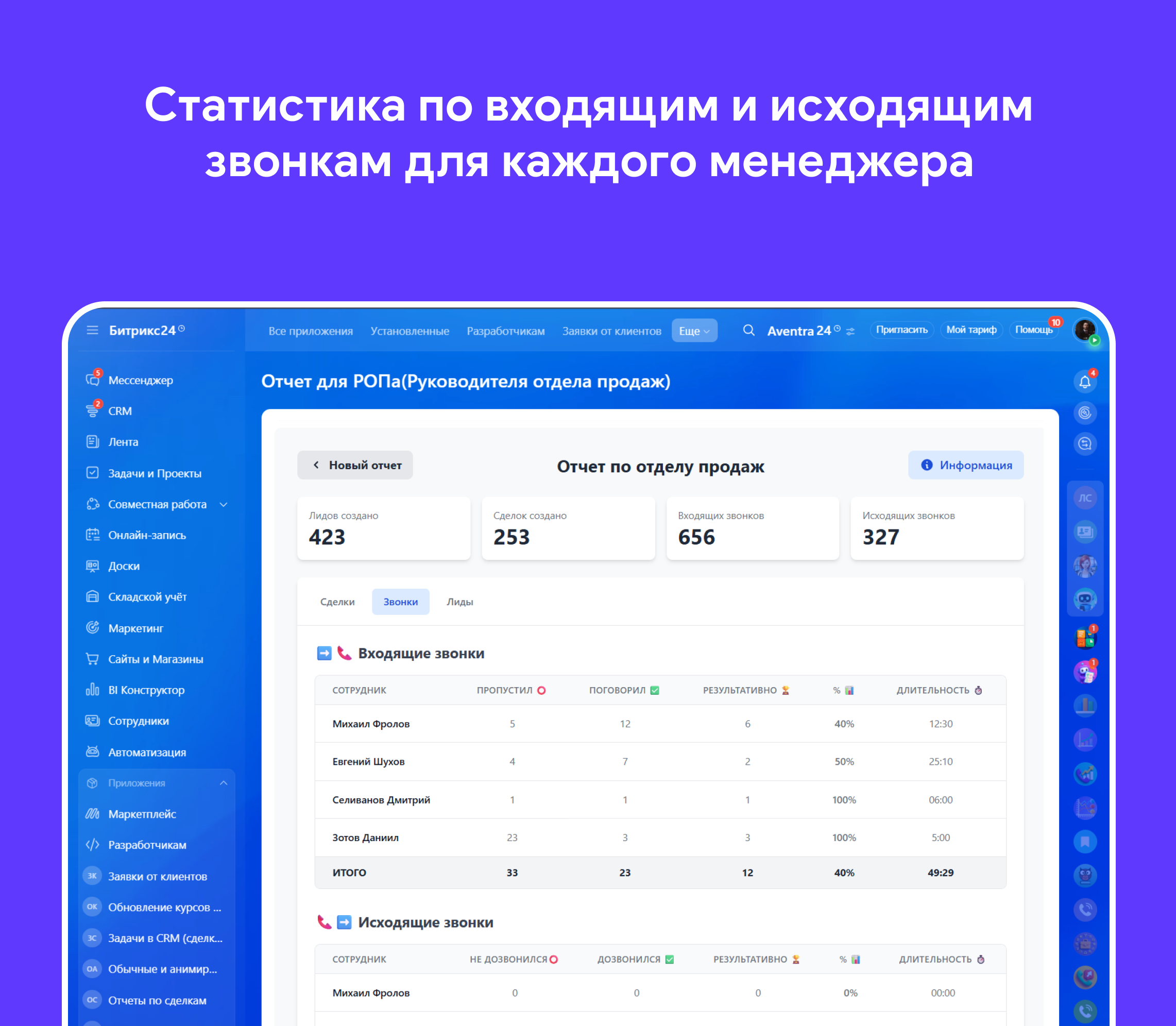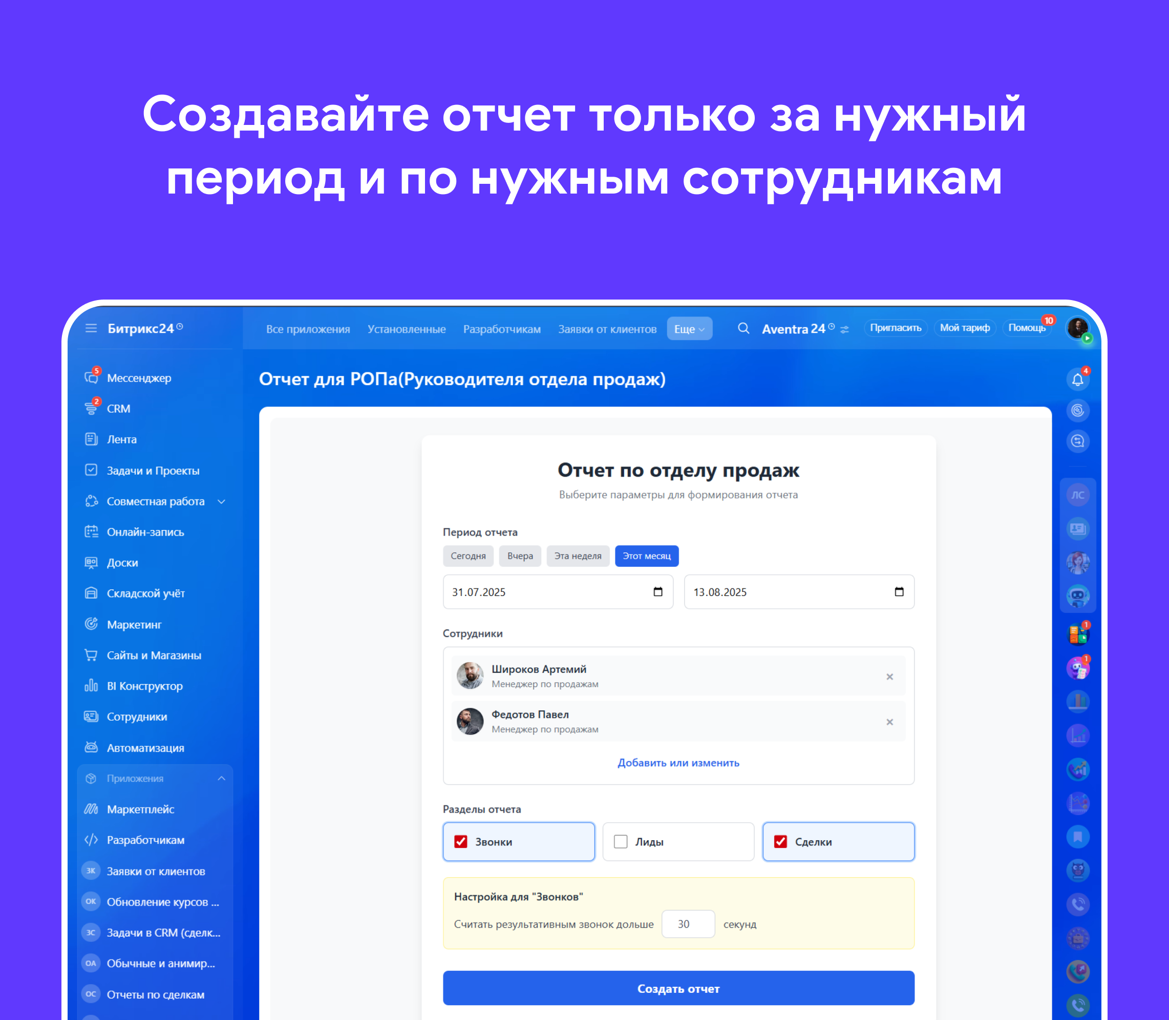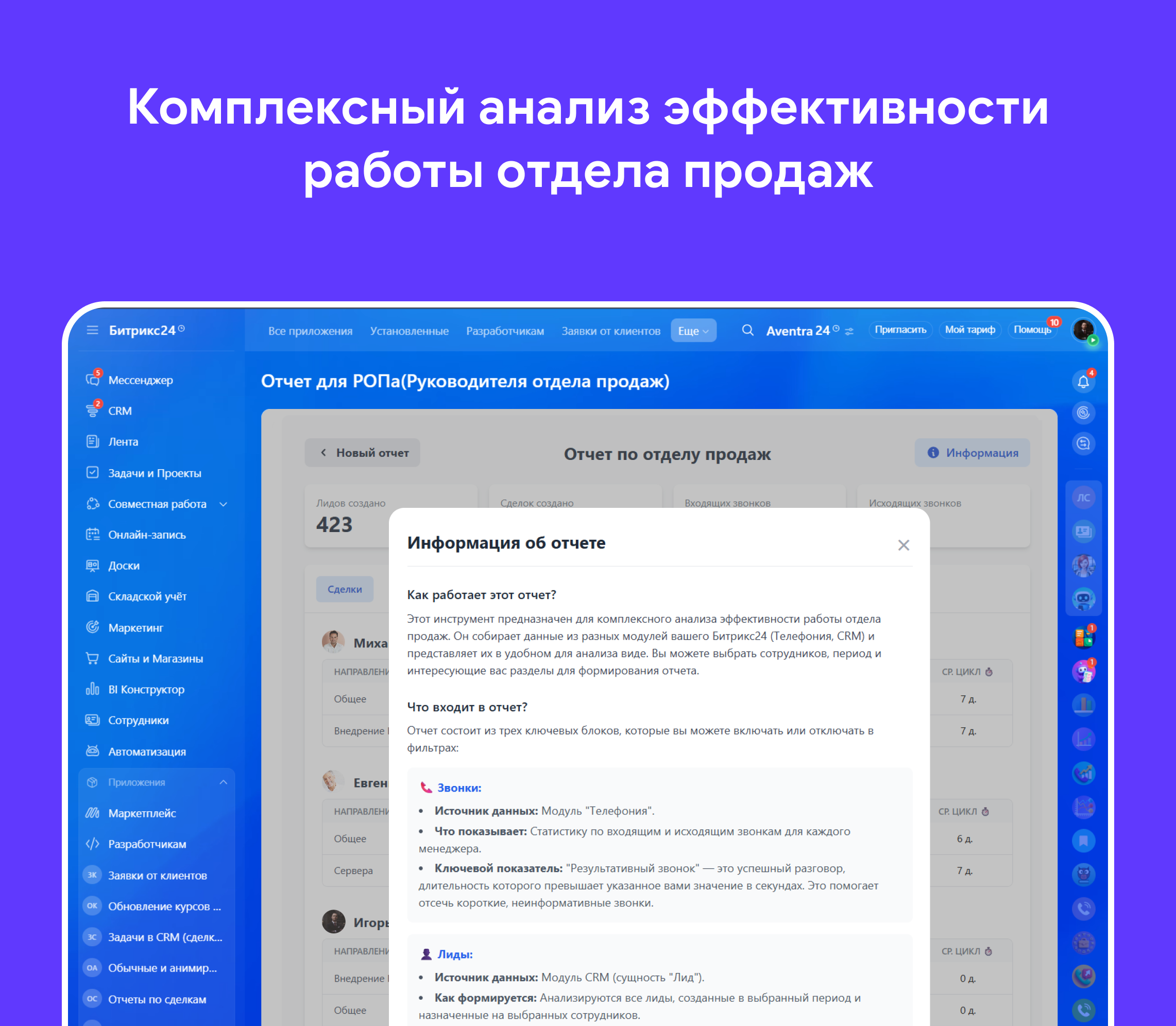 Приложение предназначено для комплексного анализа эффективности работы отдела продаж. Он собирает данные из разных модулей вашего портала (Телефония, CRM) и представляет их в удобном для анализа виде. Вы можете выбрать сотрудников, период и интересующие вас разделы для формирования отчета.