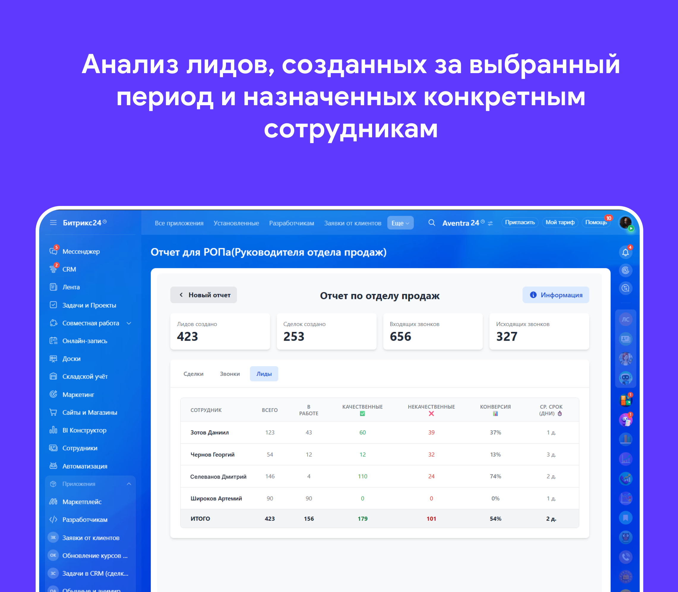 - Как формируется: Анализируются все лиды, созданные в выбранный период и назначенные на выбранных сотрудников.