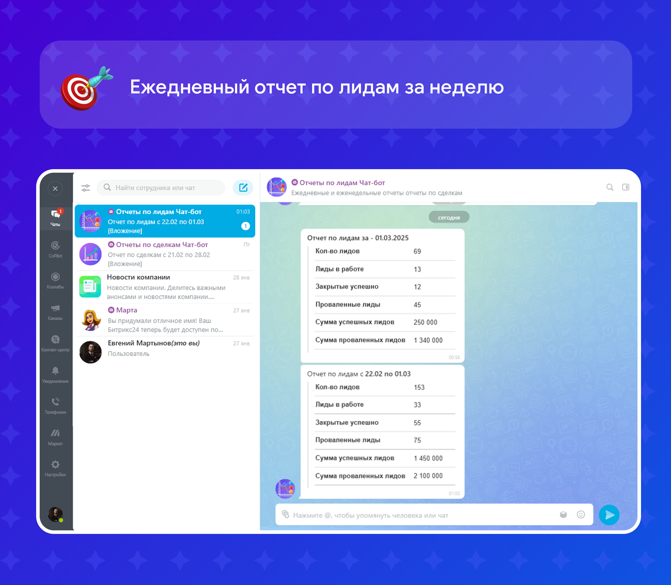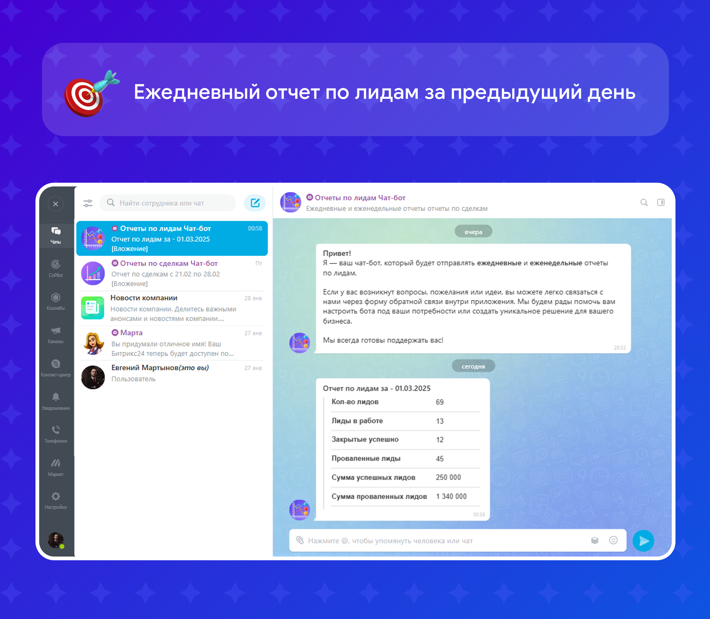 Получайте четкие и понятные отчеты о состоянии ваших лидов прямо в чат-боте!