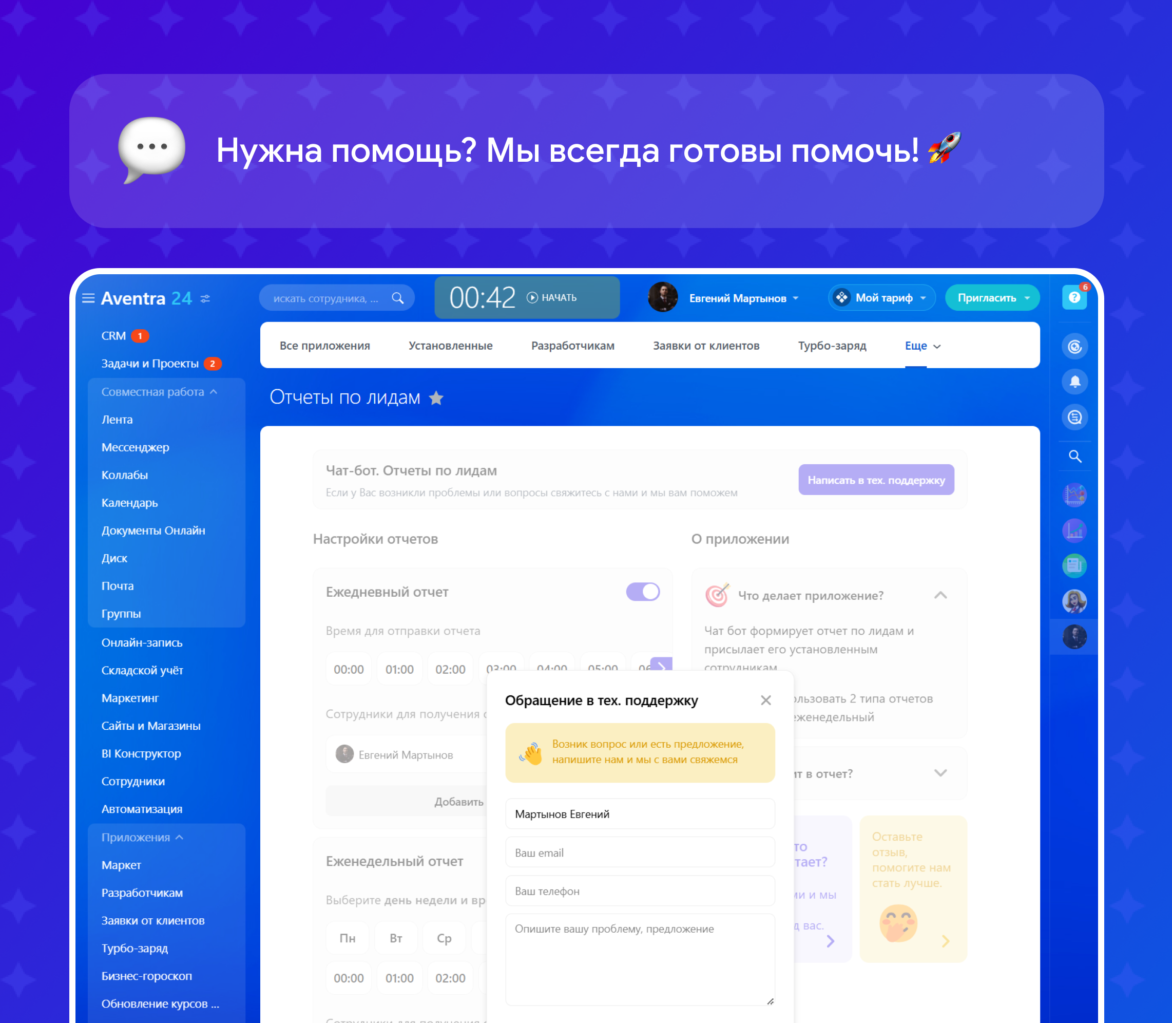 Настройка не требуется, приложение автоматически устанавливает чат-бота, который будет присылать ежедневные и еженедельные отчеты. В интерфейсе настроек вы можете управлять отправлением ежедневных и еженедельных отчетов руководителям и устанавливать время отправки отчета.