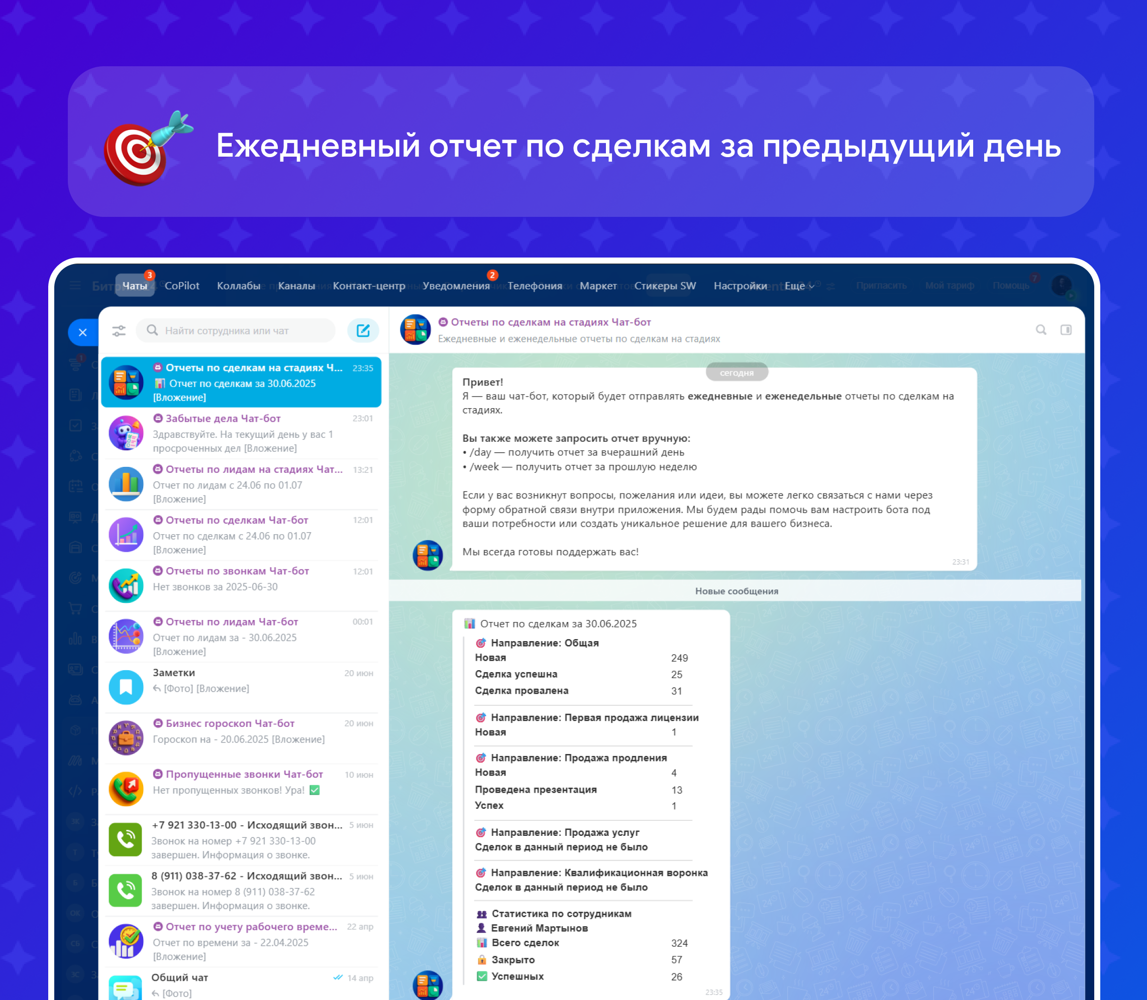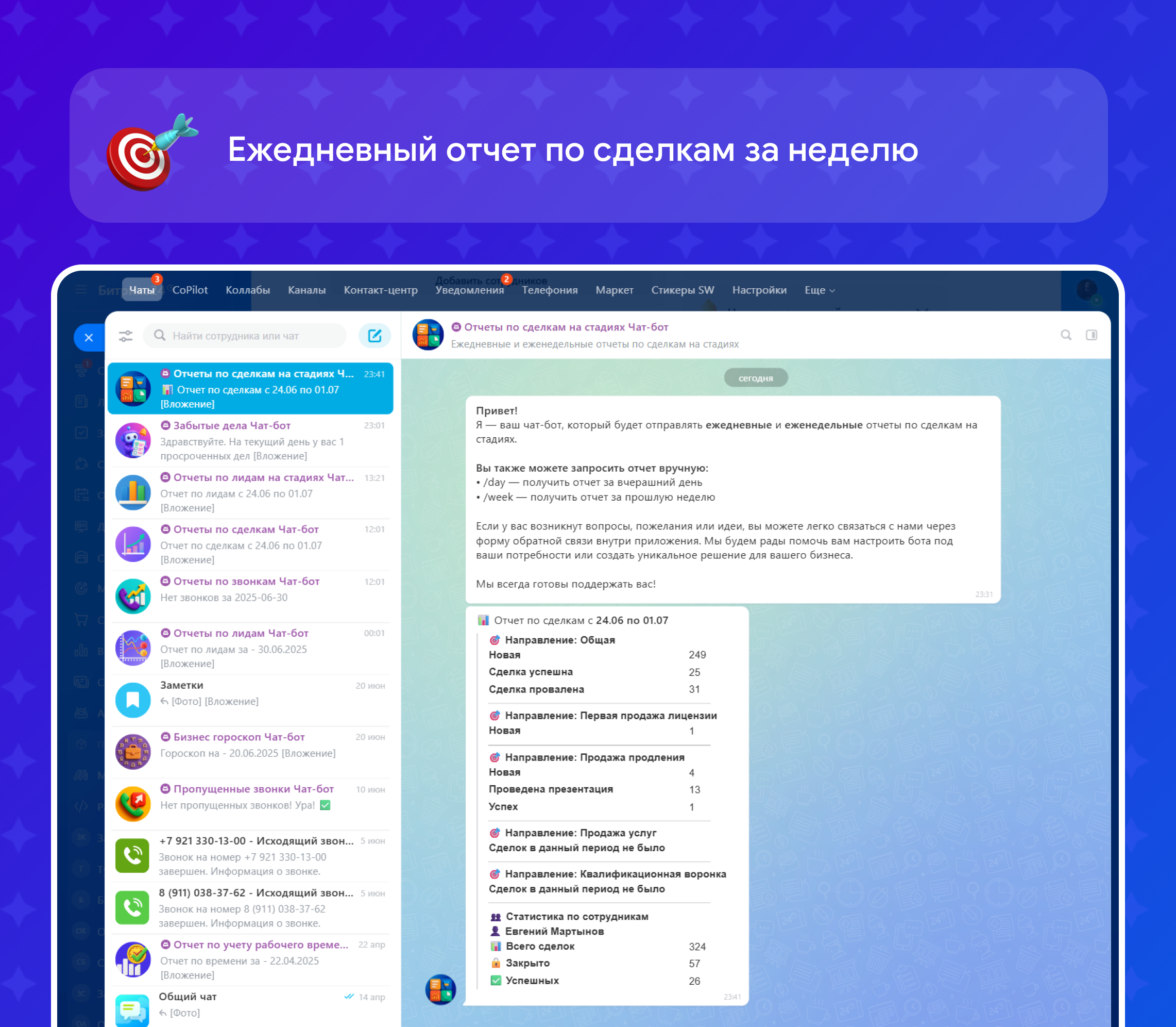Получайте четкие и понятные отчеты о сделках по стадиям прямо в чат-боте!
