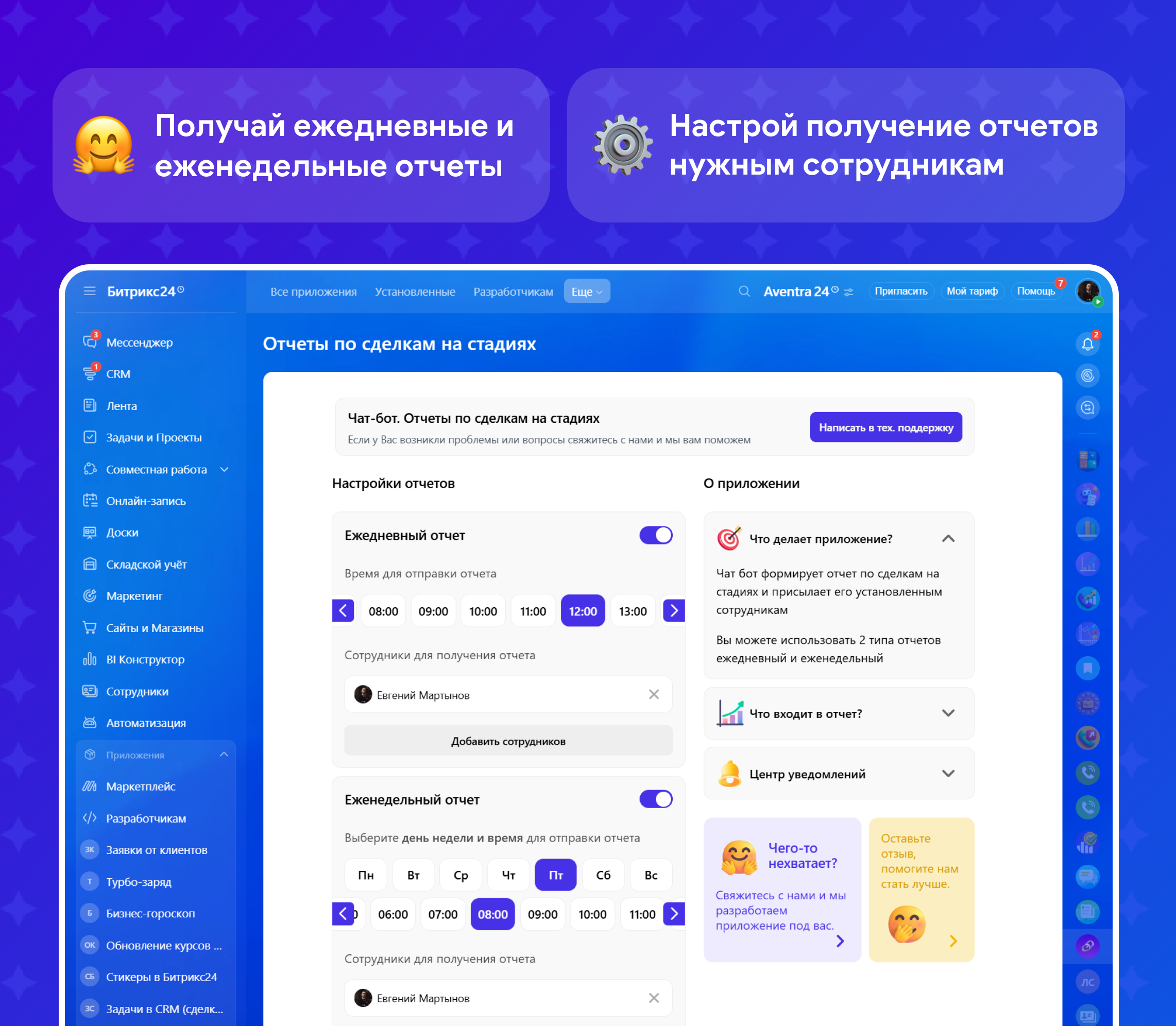 Настройка не требуется, приложение автоматически устанавливает чат-бота, который будет присылать ежедневные и еженедельные отчеты. В интерфейсе настроек вы можете управлять отправлением ежедневных и еженедельных отчетов руководителям и устанавливать время отправки отчета.