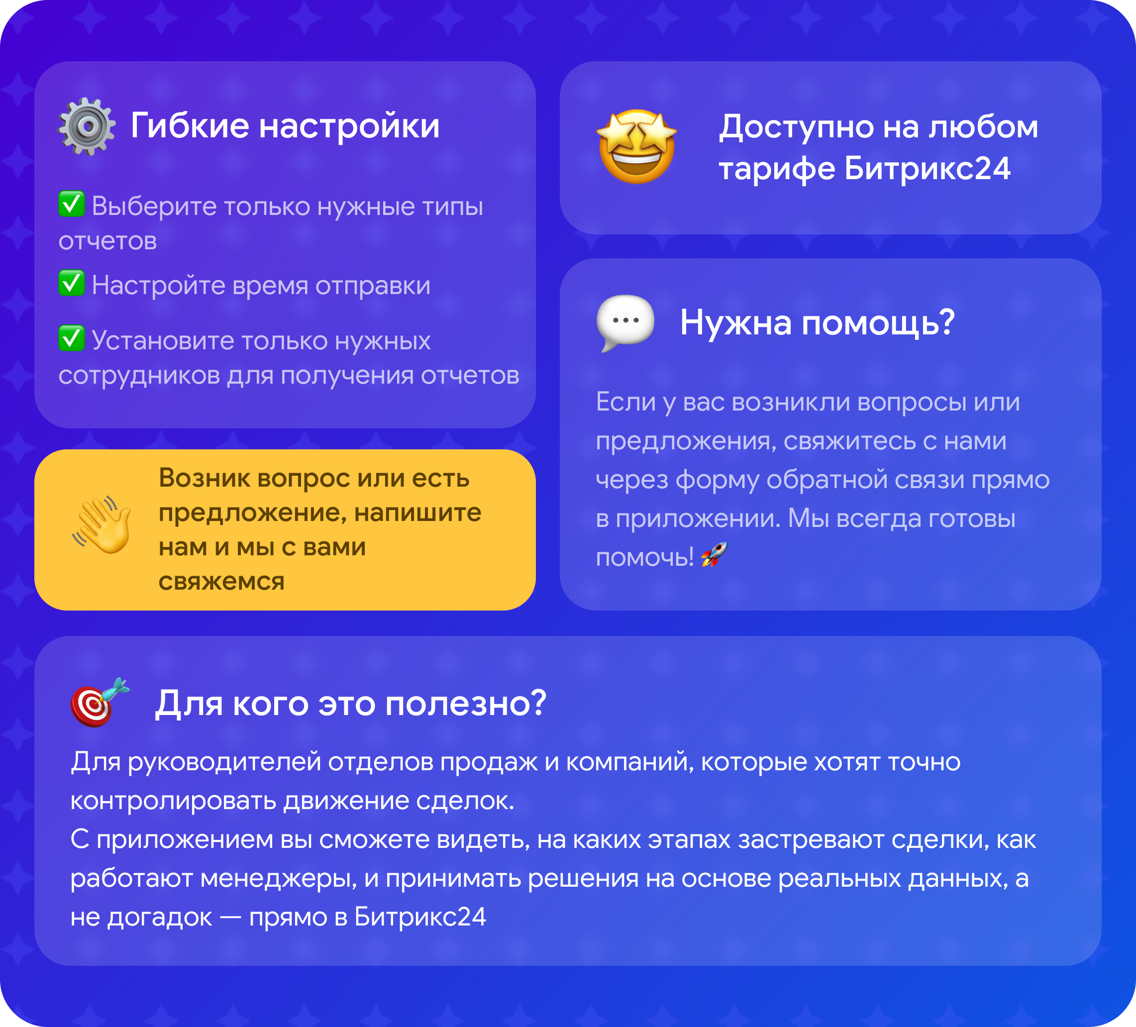Получай ежедневные и еженедельные отчеты по сделках на стадиях. Общий отчет по всем сделкам
