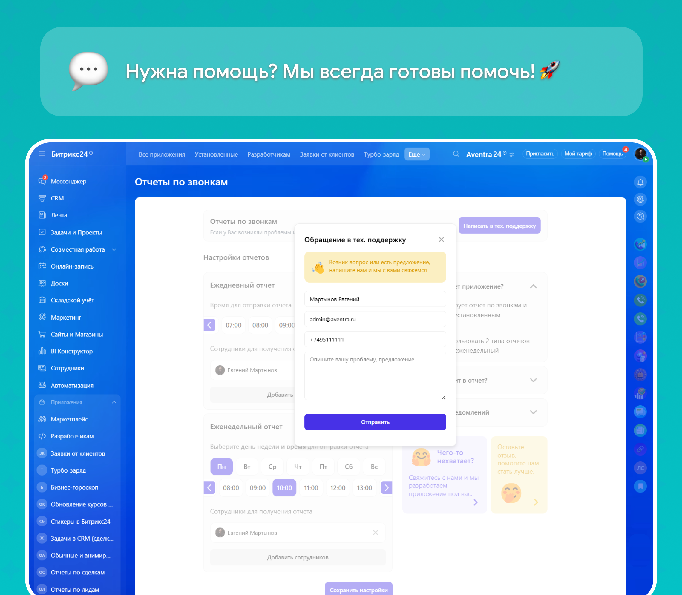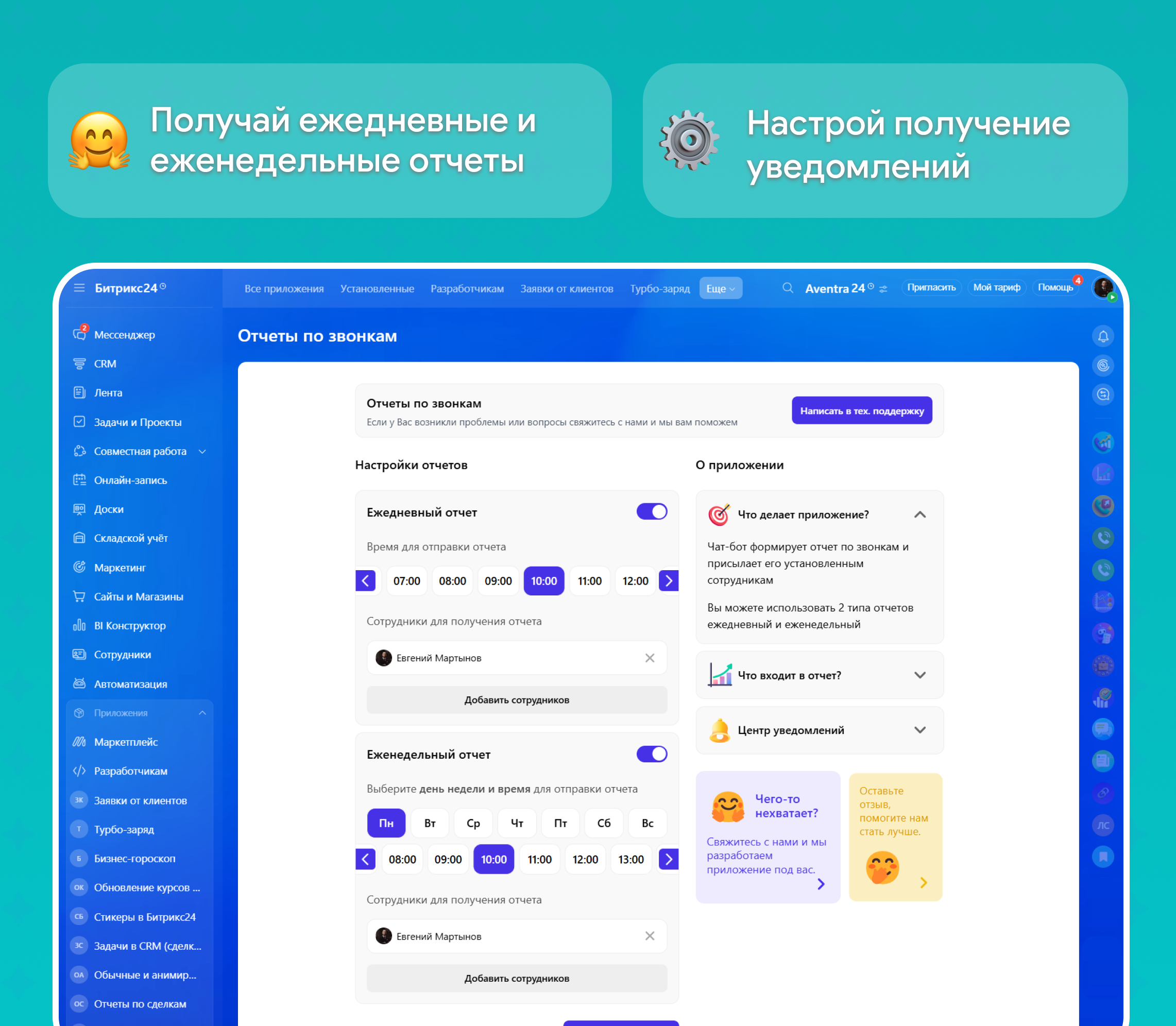Настройка не требуется, приложение автоматически устанавливает чат-бота, который будет присылать ежедневные и еженедельные отчеты. В интерфейсе настроек вы можете управлять отправлением ежедневных и еженедельных отчетов руководителям и устанавливать время отправки отчета.
