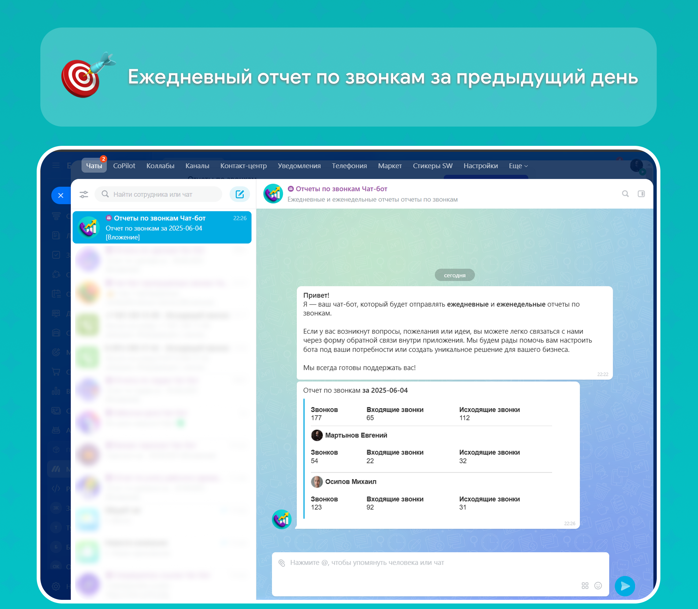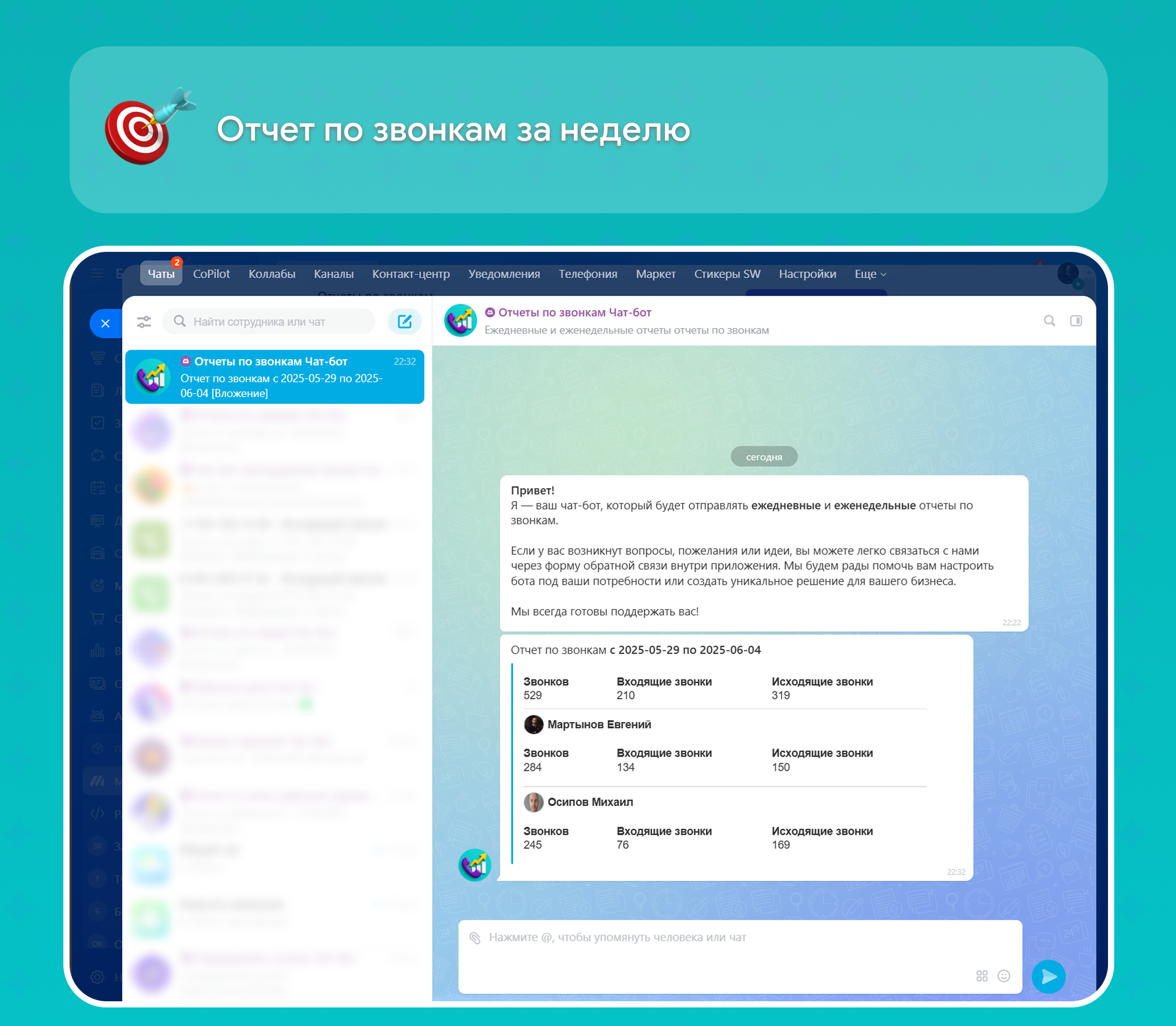 Отчеты по звонкам - ваш личный ассистент, который сам собирает статистику звонков и присылает её выбранным сотрудникам в чат.