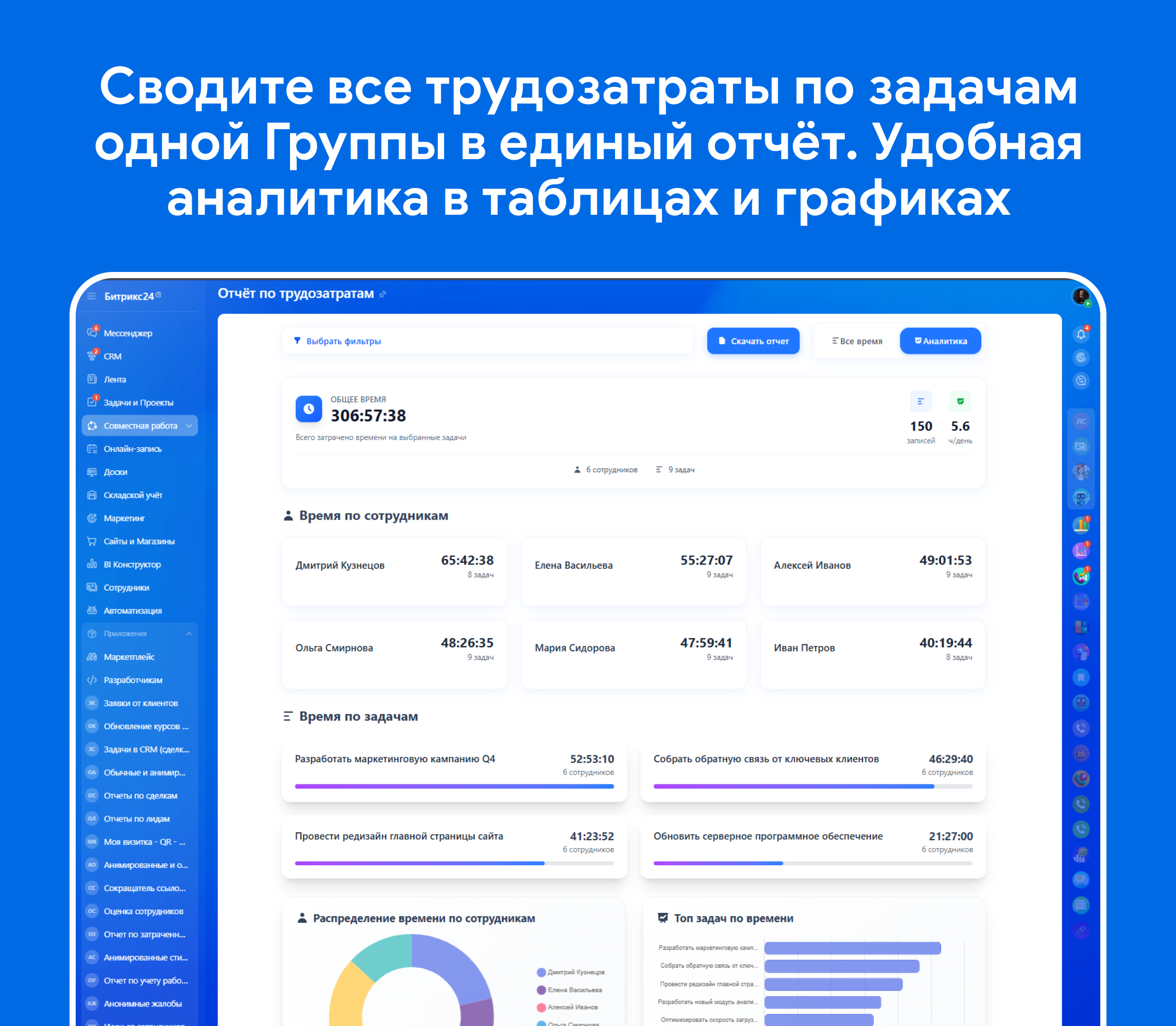 Помогает увидеть распределение времени: по сотрудникам, по задачам, по дням.