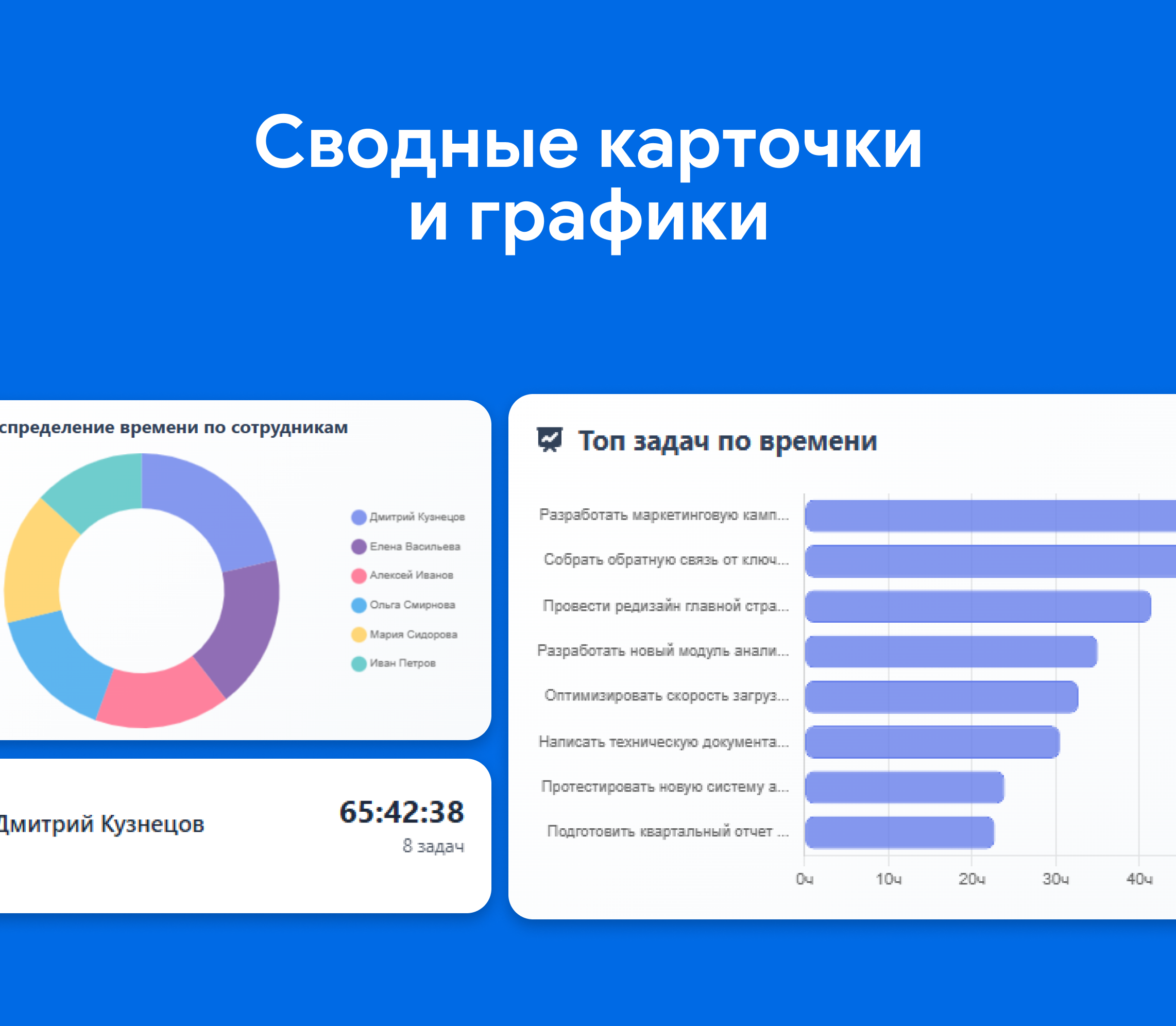 по сотрудникам (сумма часов, количество задач, сравнительные прогресс-барры),