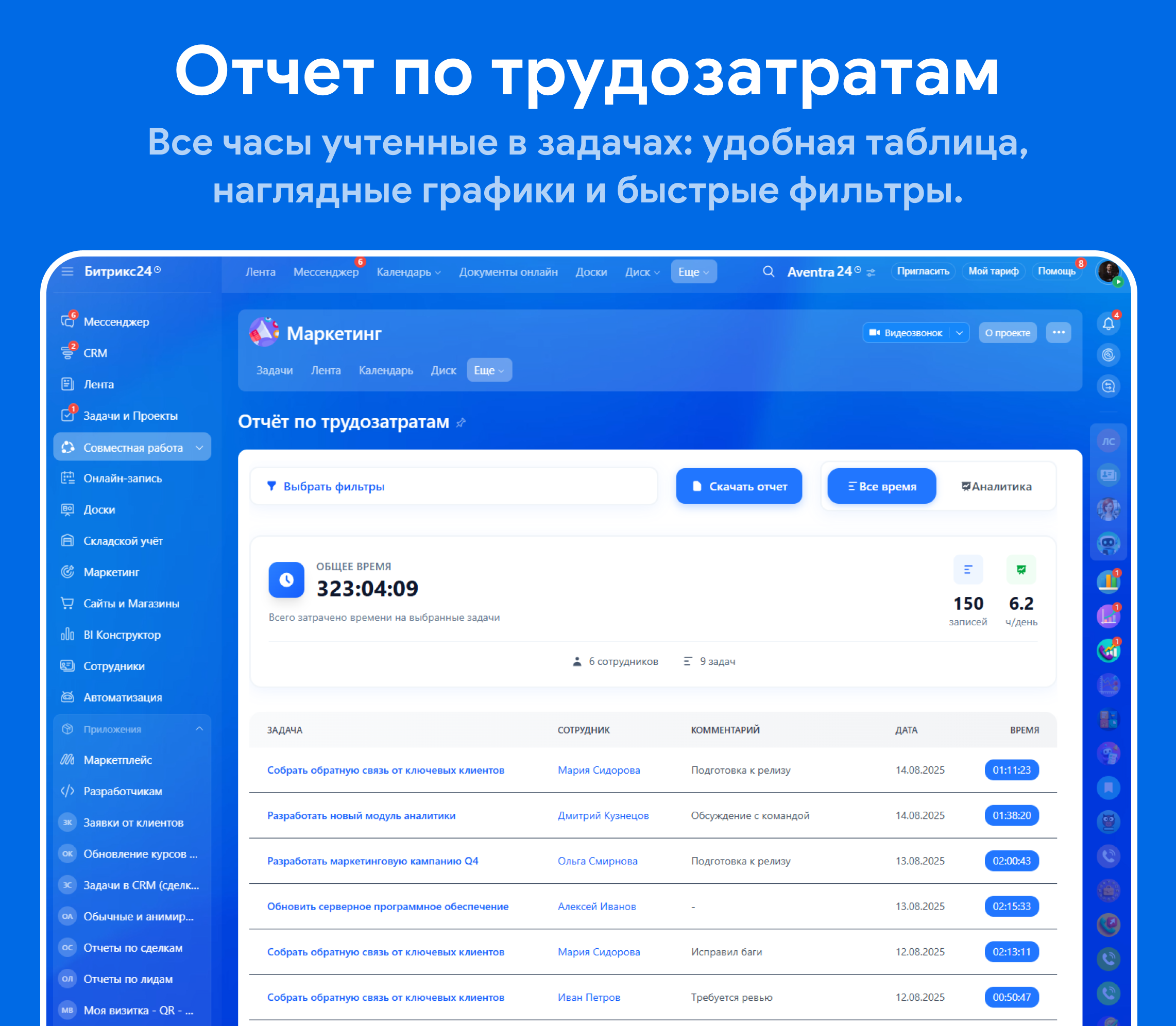 Ускоряет контроль загрузки и «узких мест»: кто и над чем тратит больше всего времени.